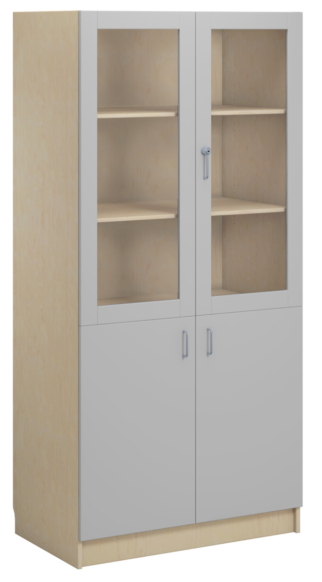 Materialskåp med stomme i direktlaminat. Fronter kan fås med antingen direktlaminat eller högtryckslaminat. Inredd med 5 hyllplan varav 3 flyttbara, 2 dörrar i härdat glas med regellås (inkl. 2 nycklar) och 2 hela dörrar med handtag. 170 graders öppningsvinkel. Högtryckslaminat på fronten gör att den får en extremt tålig yta.