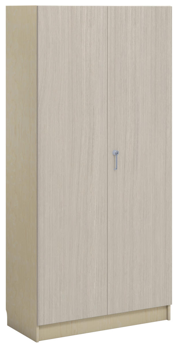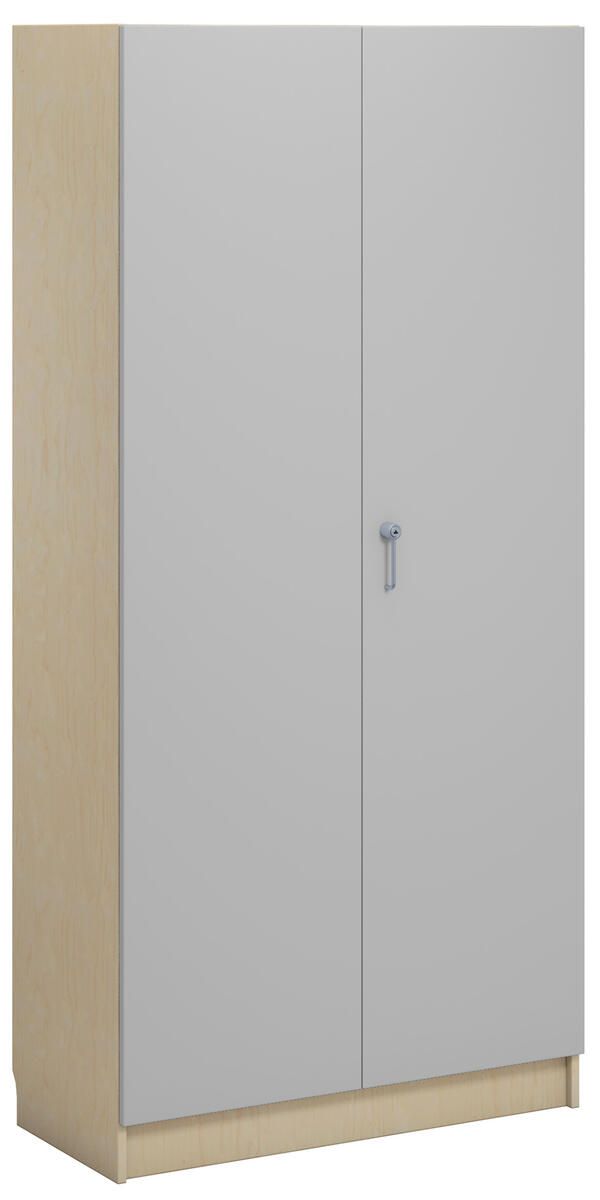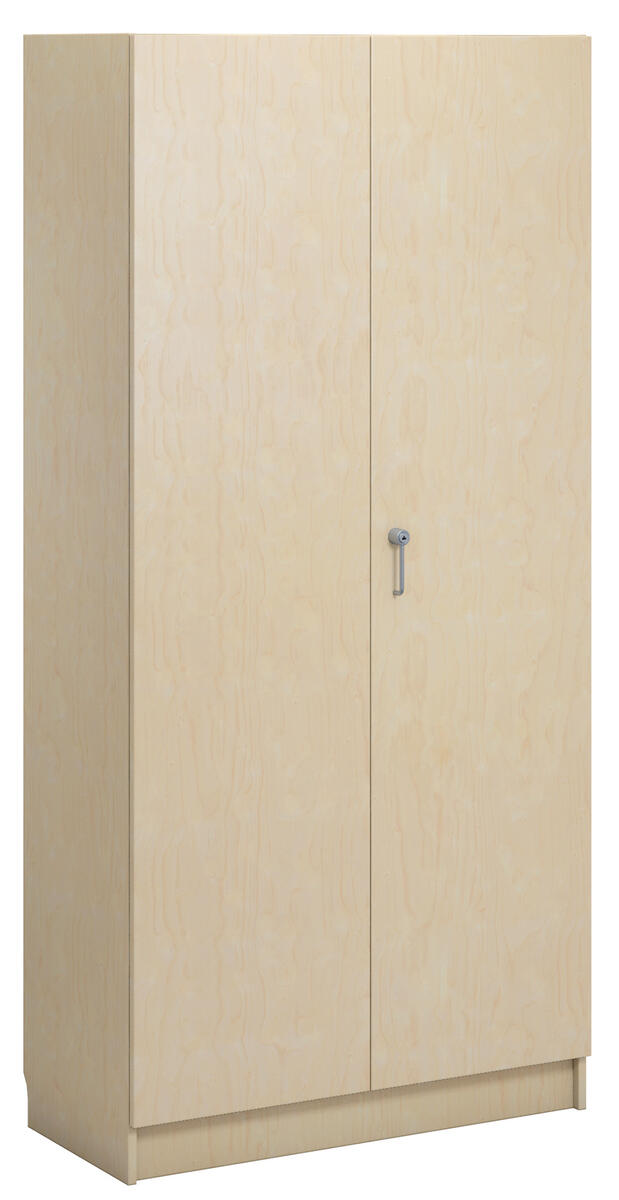 Materialskåp med stomme i direktlaminat. Fronter kan fås med antingen direktlaminat eller högtryckslaminat. Inredd med 5 hyllplan varav 3 flyttbara, 2 hela dörrar med spanjolettlås (inkl. 2 nycklar) och 170 graders öppningsvinkel.