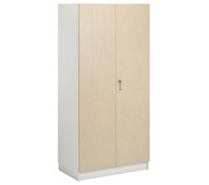 Materialskåp med stomme i direktlaminat. Fronter kan fås med antingen direktlaminat eller högtryckslaminat. Inredd med 5 hyllplan varav 3 flyttbara, 2 hela dörrar med spanjolettlås (inkl. 2 nycklar) och 170 graders öppningsvinkel. Högtryckslaminat på fronten gör att den får en extremt tålig yta.