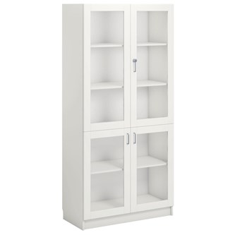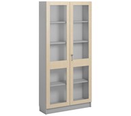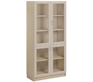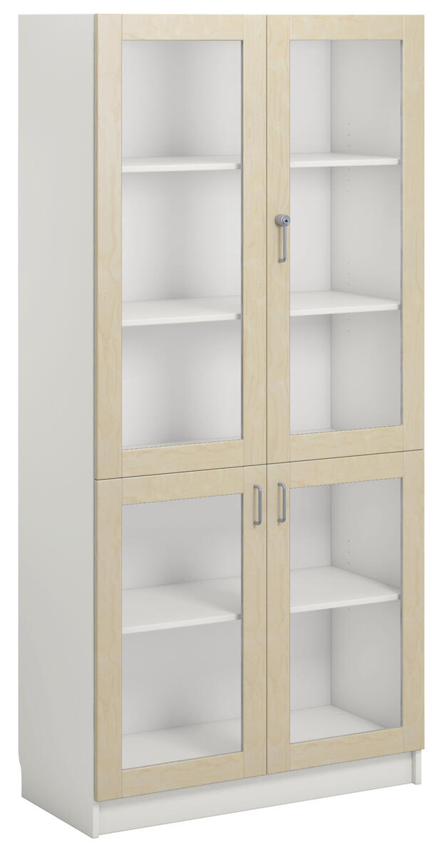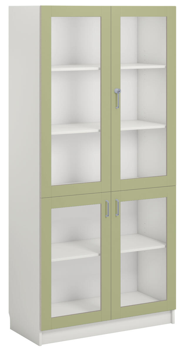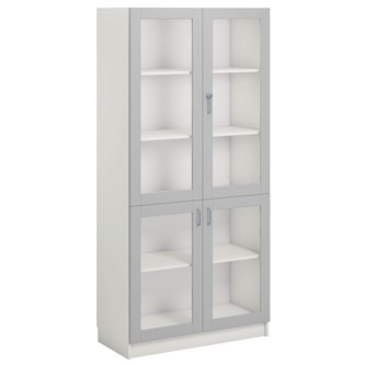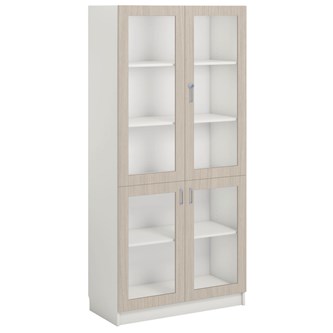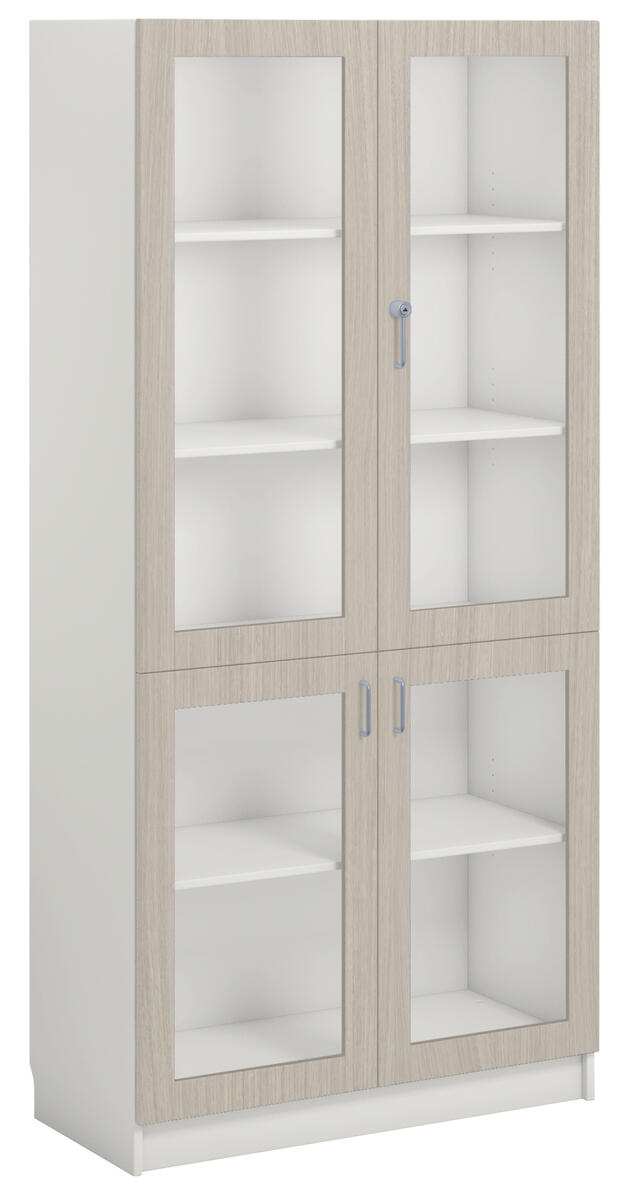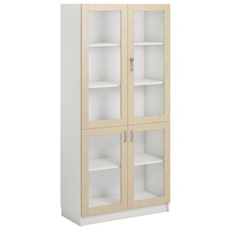 Materialskåp med stomme i direktlaminat. Fronter kan fås med antingen direktlaminat eller högtryckslaminat. Inredd med 5 hyllplan varav 3 flyttbara, 2 dörrar i härdat glas med regellås (inkl. 2 nycklar) och 2 dörrar i härdat glas med handtag, 170 graders öppningsvinkel. Högtryckslaminat på fronten gör att den får en extremt tålig yta.