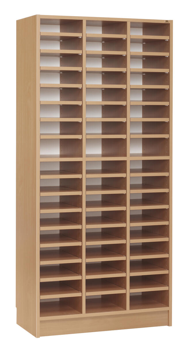 3 fack i bredd och 6 fack i höjd. Låsning i huvudnyckelsystem. Dörrarna är försedda med brevinkast. Stomme och luckor av 19 mm spånskiva med laminat. Kantlister av ABS. Mått: B98xD40xH178 cm. Mått dörr: B32xH24 cm. Grå sockel, 20 cm hög.