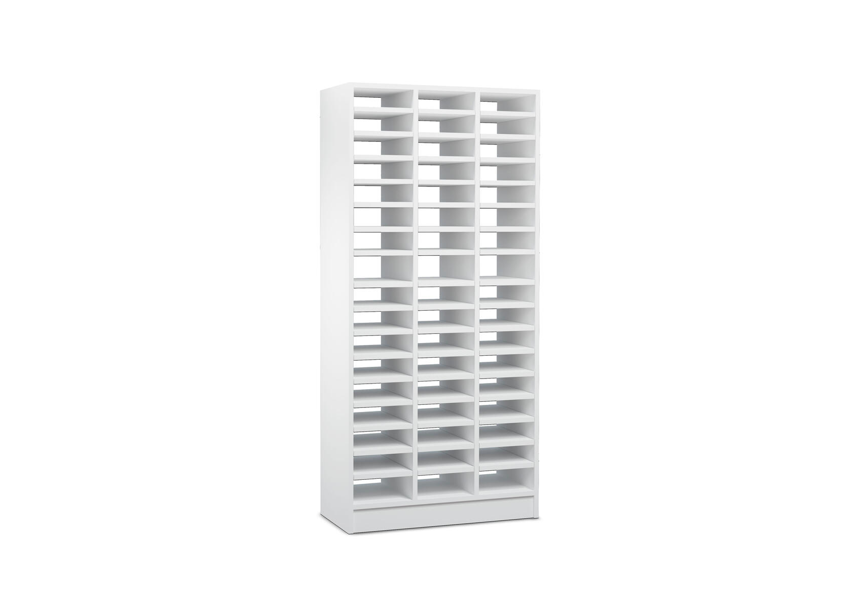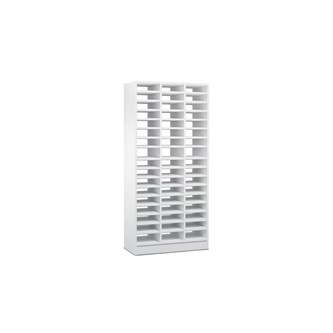 3 fack i bredd och 6 fack i höjd. Låsning i huvudnyckelsystem. Dörrarna är försedda med brevinkast. Stomme och luckor av 19 mm spånskiva med laminat. Kantlister av ABS. Mått: B98xD40xH178 cm. Mått dörr: B32xH24 cm. Grå sockel, 20 cm hög.