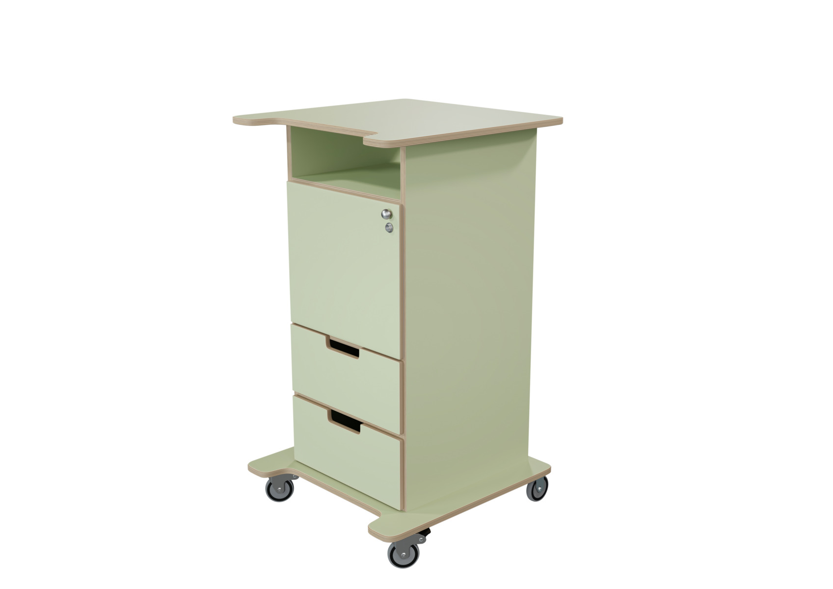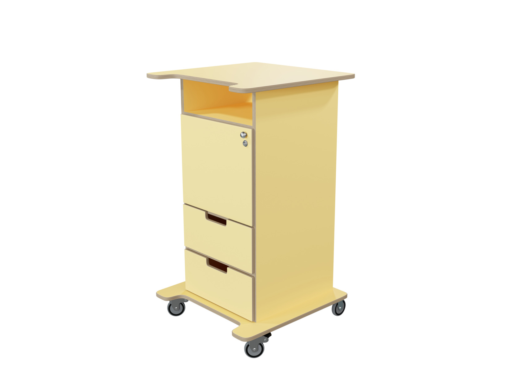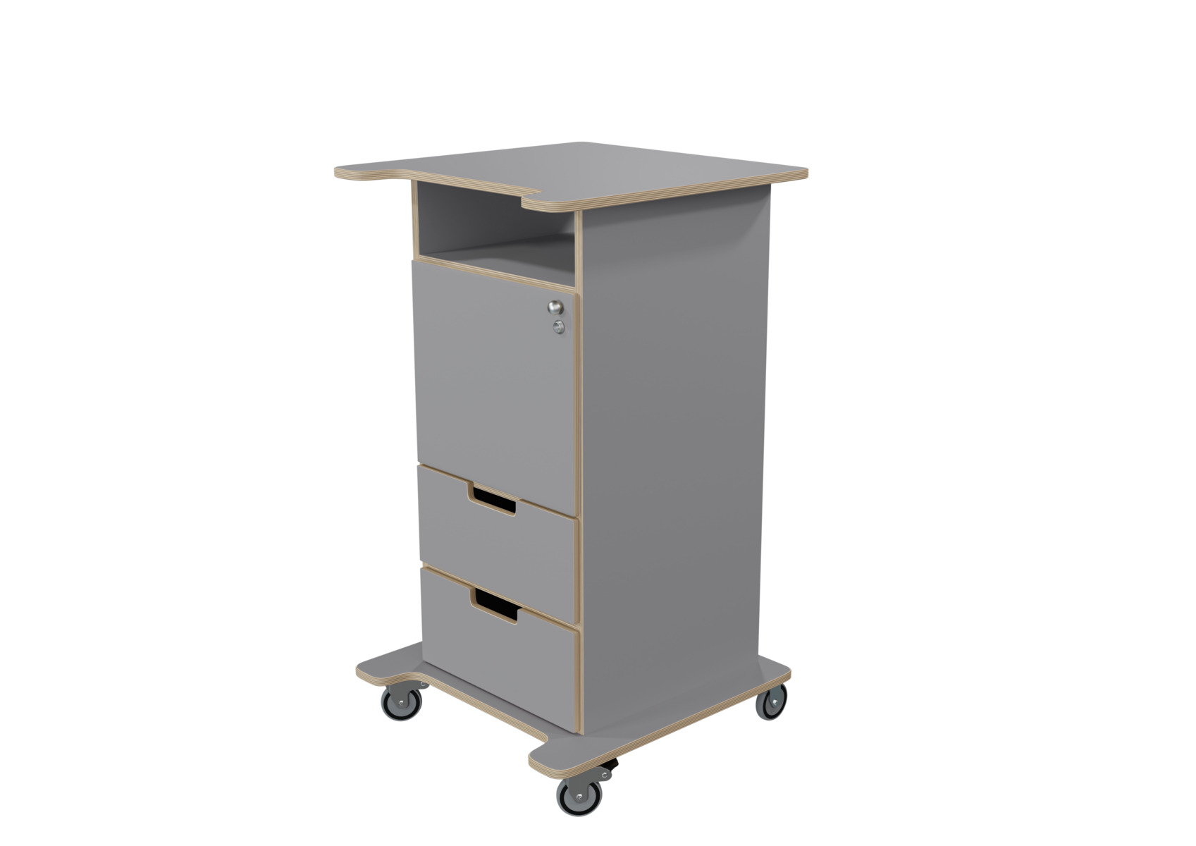 Praktisk ståpulpet med bred bottenplatta för ökad stabilitet och säkerhet. Fyra hjul varav de två främre låsbara. De två bakre är fasta hjul vilket medför en stabil förflyttning. Passar bra i både skolans och förskolans miljö. Utrustad med en låsbar dörr, ett hyllplan och två lådor, där den övre lådan är låsbar (inkl. 2 nycklar). Mått: B46 H106 D43 cm. Mått toppskiva: B65xD57 cm. Bottenplattans bredd 64 cm och djup 55 cm.