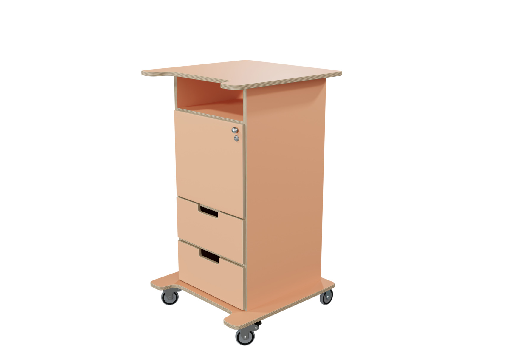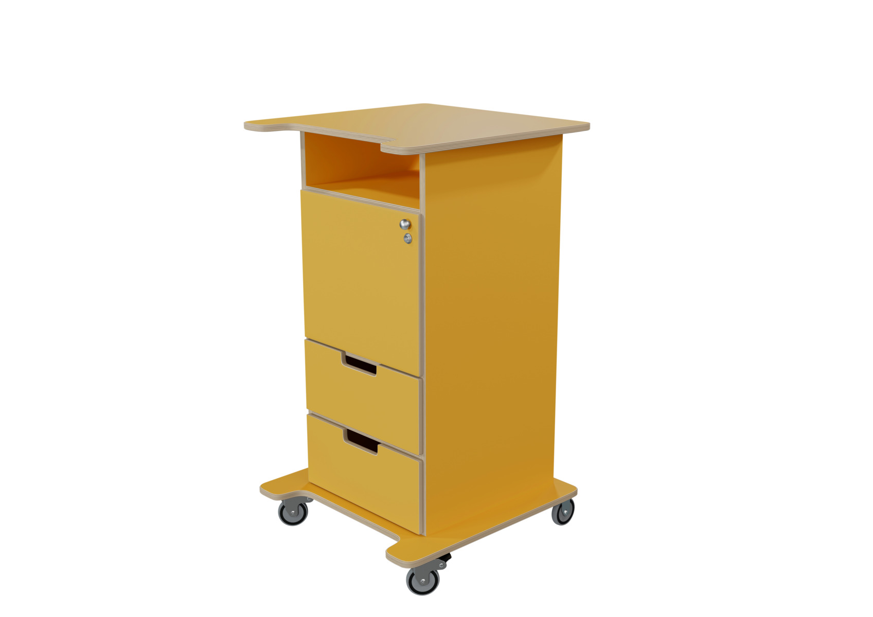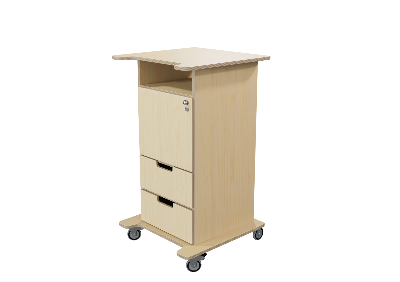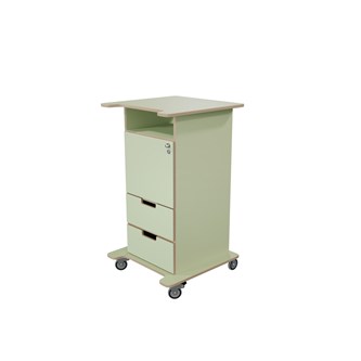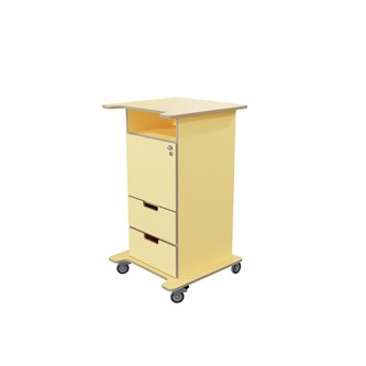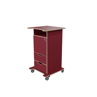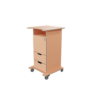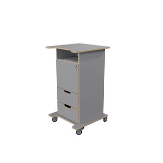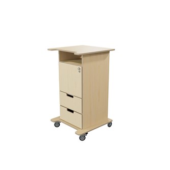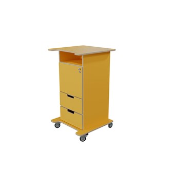 Praktisk ståpulpet med bred bottenplatta för ökad stabilitet och säkerhet. Fem hjul varav tre roterbara, ett hjul undertill, de två främre låsbara. De två bakre är fasta hjul vilket medför en stabil förflyttning. Passar bra i både skolans och förskolans miljö. Utrustad med 1 hylla och 2 mindre lådor, där den övre lådan är låsbar (inkl. två nycklar). Mått topplatta: B65xD57 cm. Mått: B46 H106 D43 cm. Höjd till klaff är 75 cm.