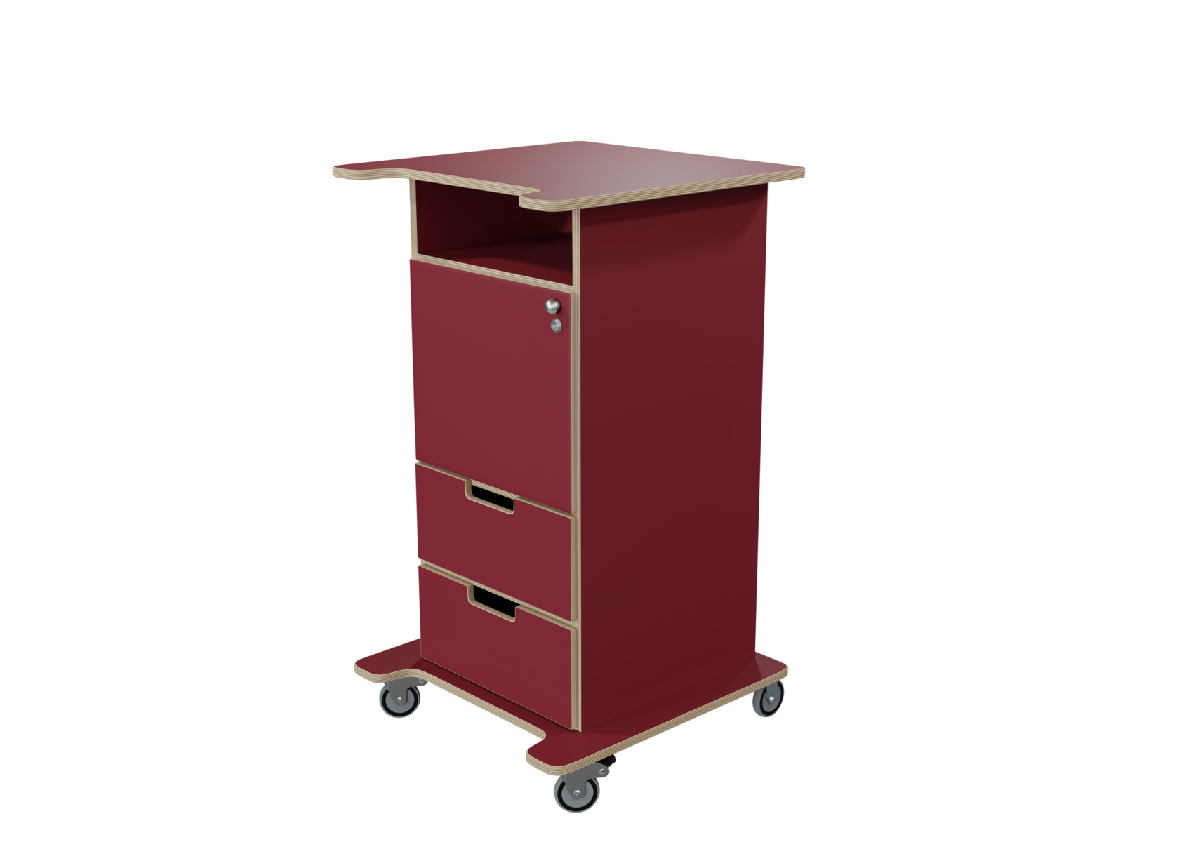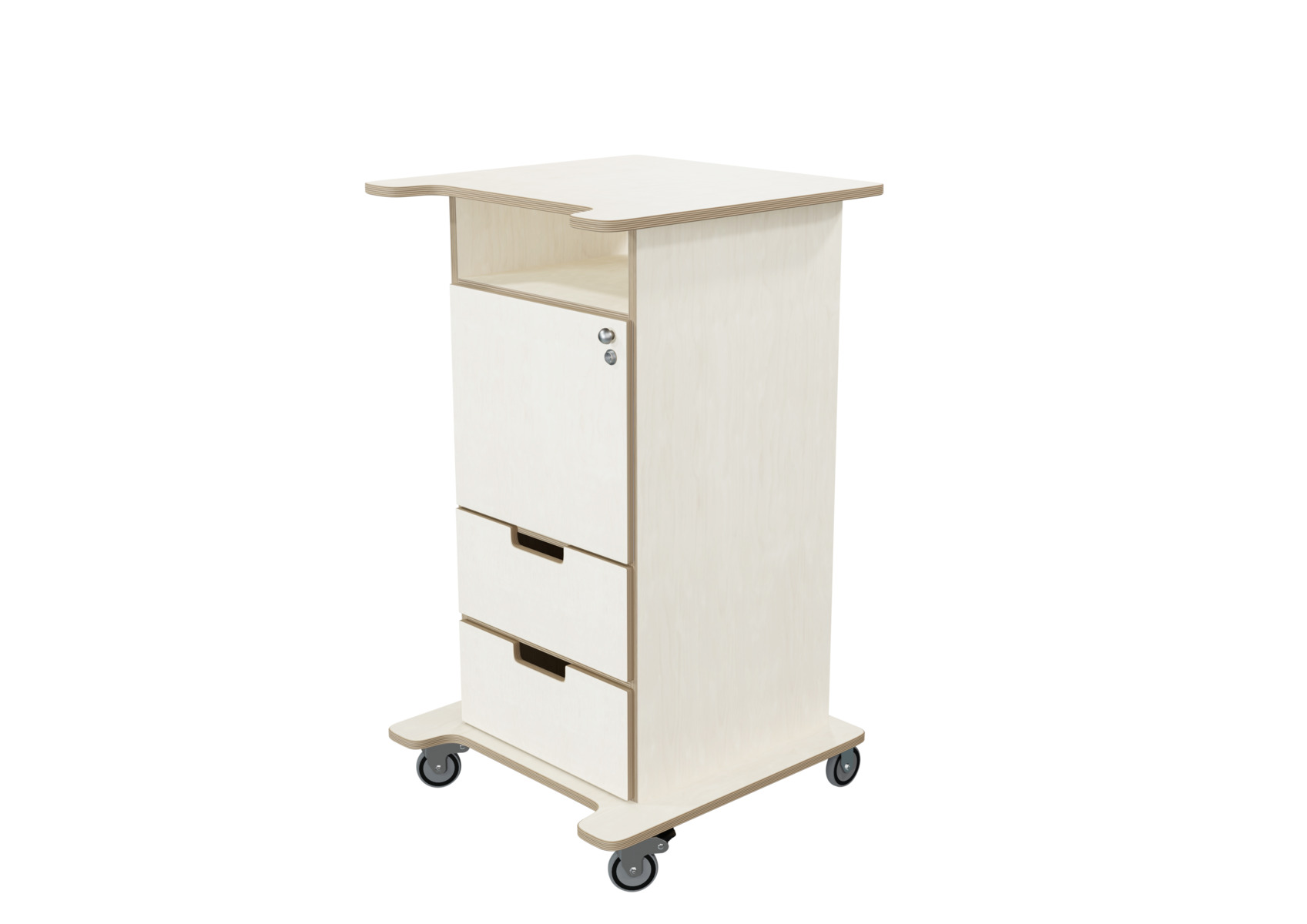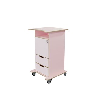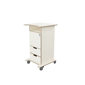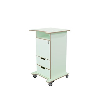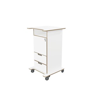 Pulpet med öppet fack, dörr med knopp och lås samt två lådor med handhål. Två nycklar ingår. Fyra hjul varav två låsbara, kräver enkel montering. Gjord i 16 mm björkplywood. Färger med "HT" är med högtryckslaminat. Björk och vitpigmenterad är helt i 18 mm plywood. Stommens mått: B45xD46xH100 cm. Mått totalt: B60xD61xH107 cm.