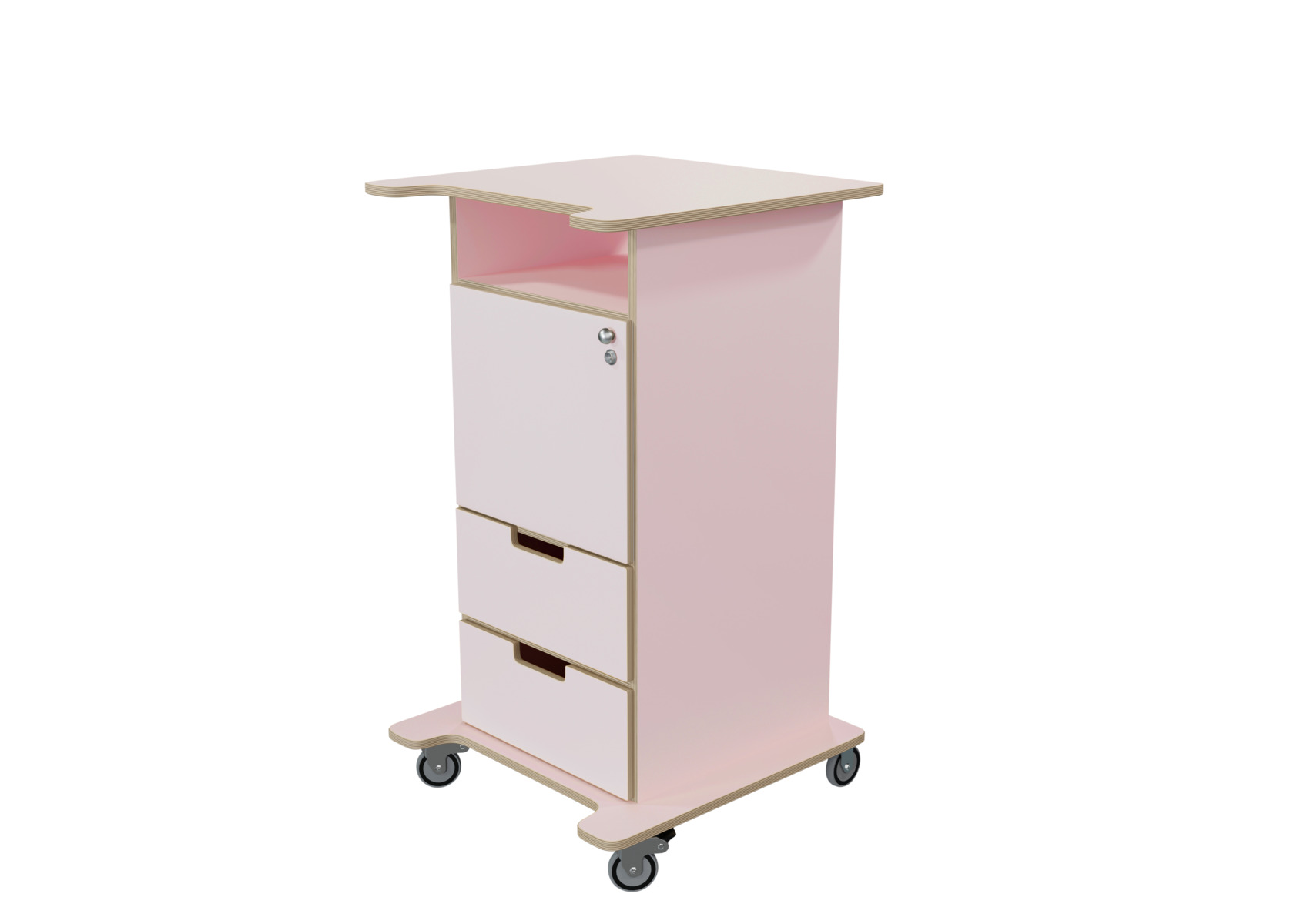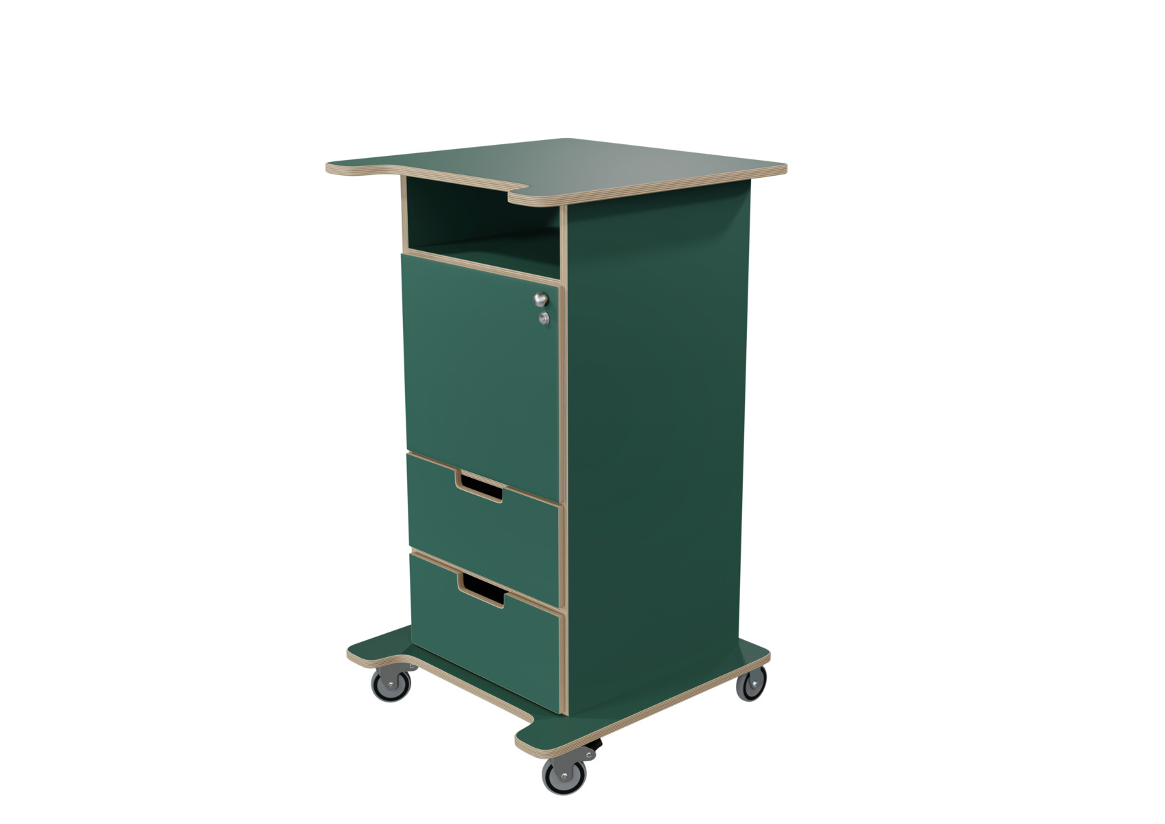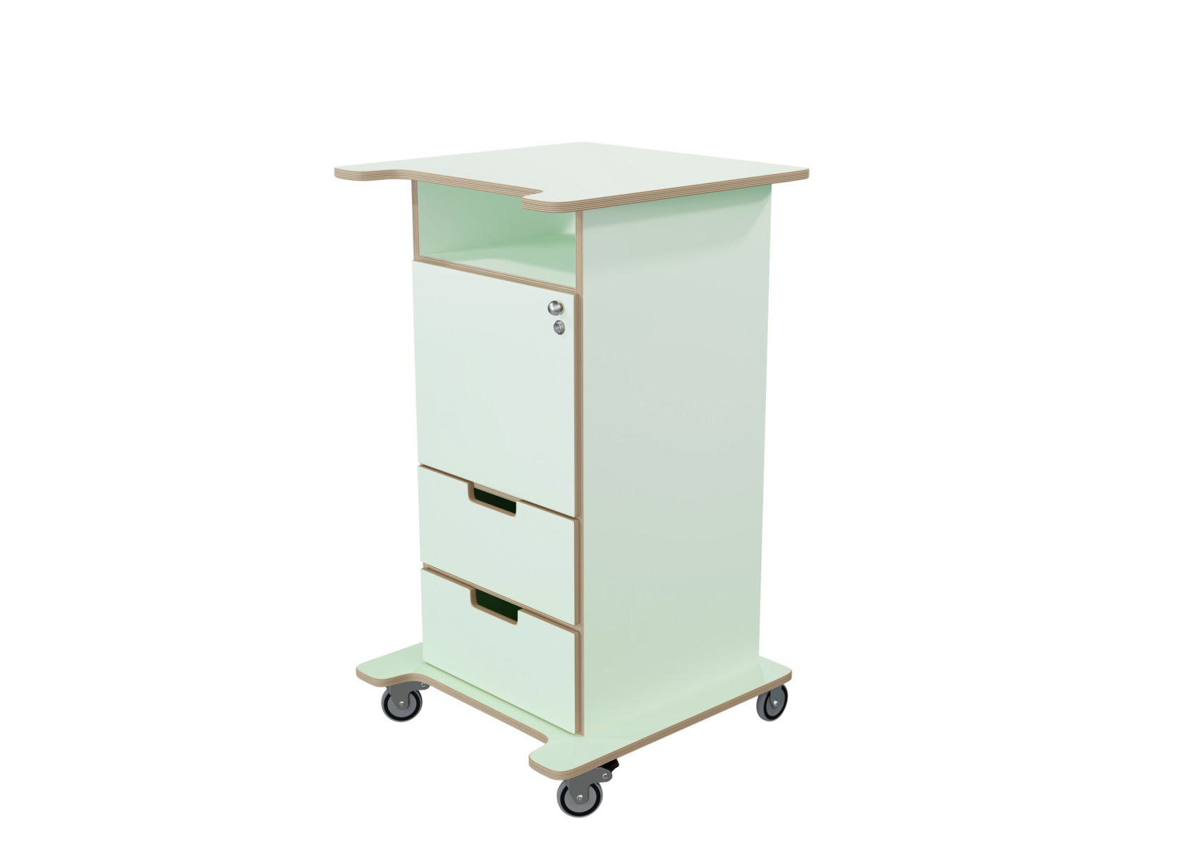 Pulpet med öppet fack, dörr med knopp och lås samt två lådor med handhål. Två nycklar ingår. Fyra hjul varav två låsbara, kräver enkel montering. Gjord i 16 mm björkplywood. Färger med "HT" är med högtryckslaminat. Björk och vitpigmenterad är helt i 18 mm plywood. Stommens mått: B45xD46xH100 cm. Mått totalt: B60xD61xH107 cm.