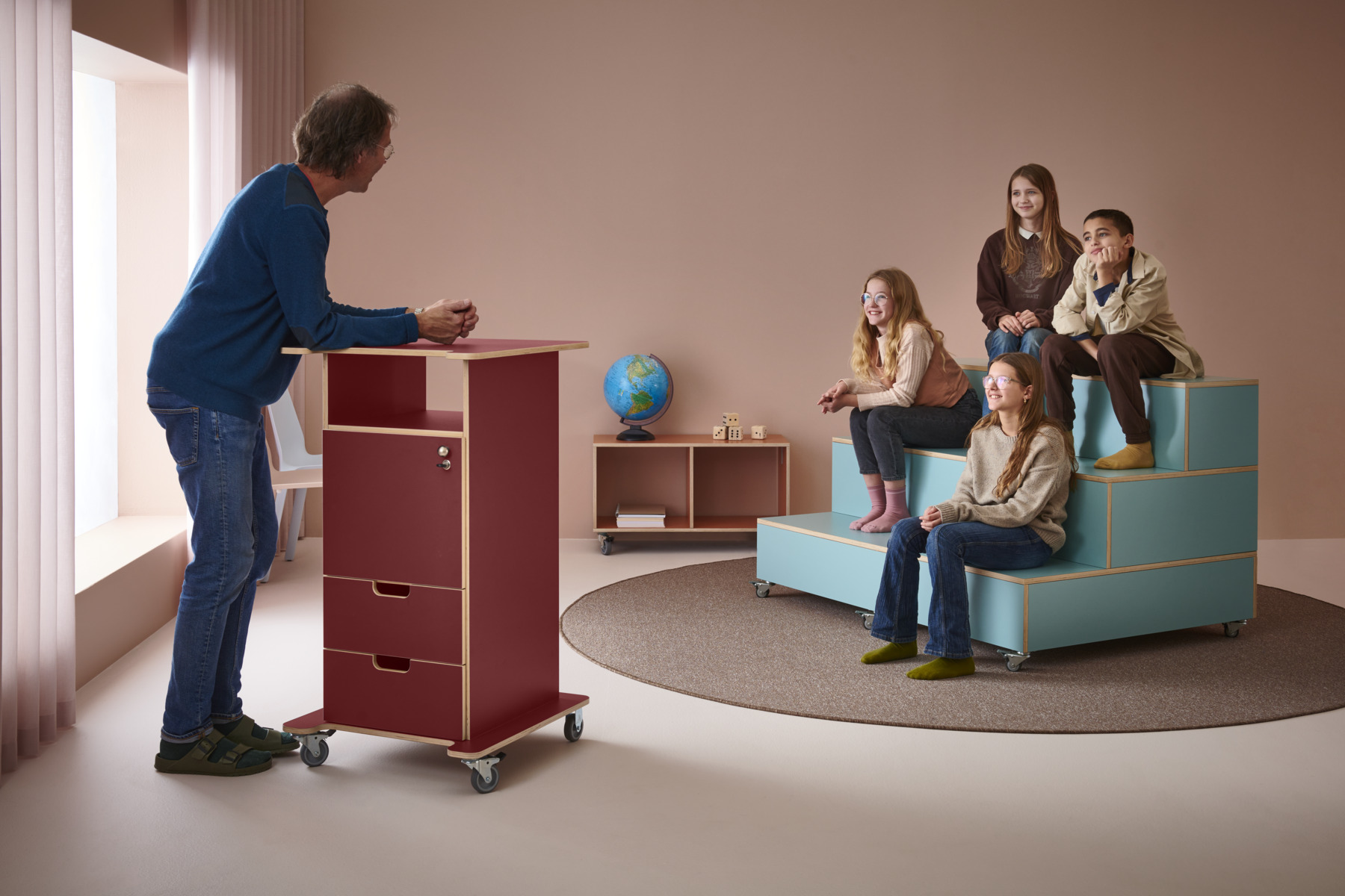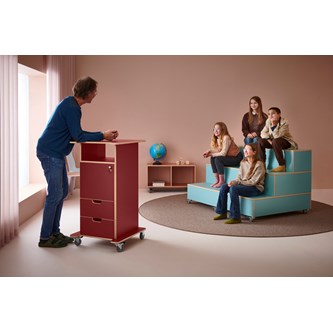 Praktisk ståpulpet med bred bottenplatta för ökad stabilitet och säkerhet. Fyra hjul varav de två främre låsbara. De två bakre är fasta hjul vilket medför en stabil förflyttning. Passar bra i både skolans och förskolans miljö. Utrustad med ett flyttbart hyllplan och två lådor, där den övre lådan är låsbar (inkl. 2 nycklar). Mått: B46 H106 D43 cm. Mått toppskiva: B65xD57 cm. Bottenplattans bredd 64 cm och djup 55 cm.
