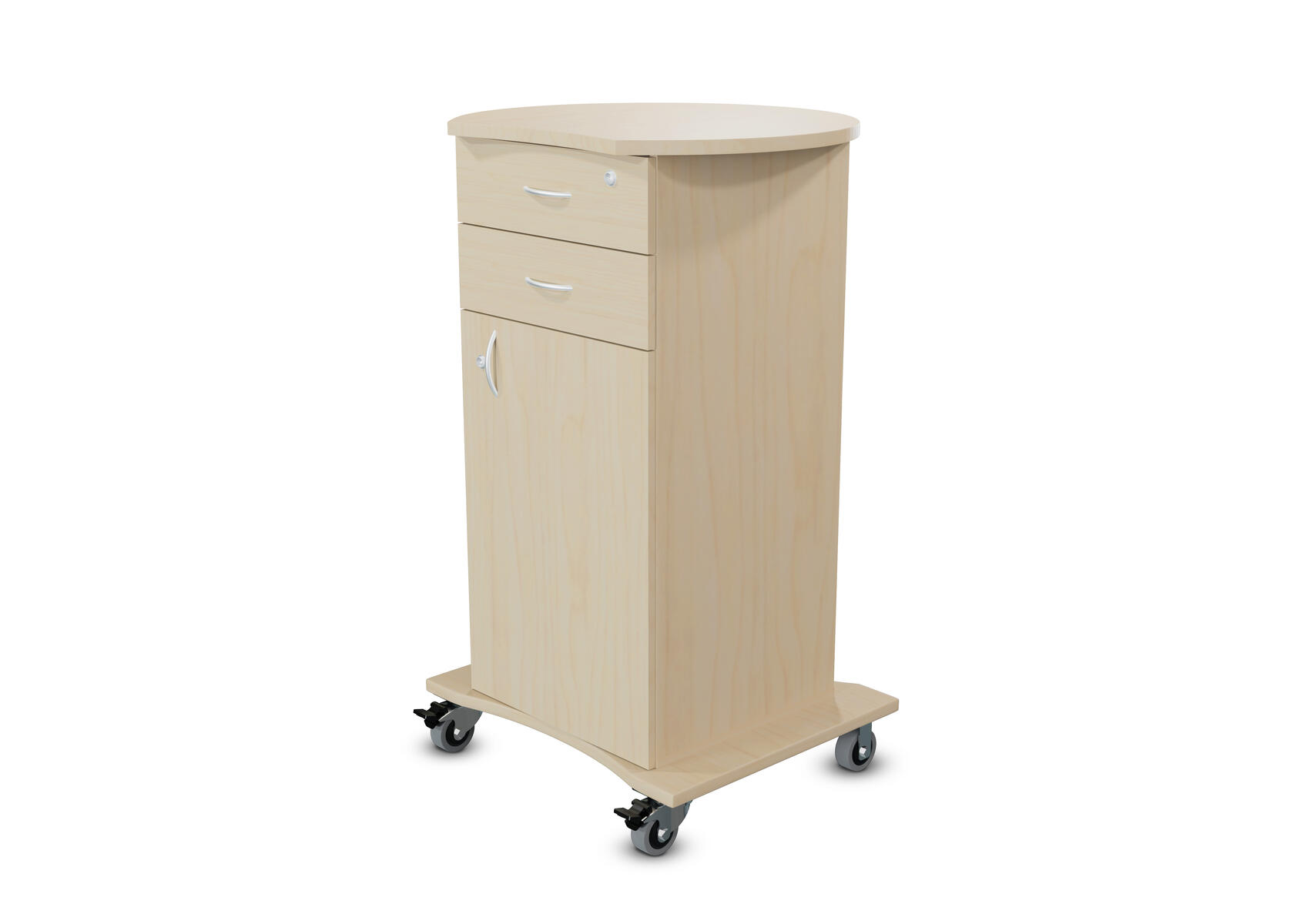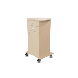 Björkstomme med val av färg på front och toppskiva. 2 fasta hjul och 2 roterbara hjul, lås på alla fyra hjulen. Höjd hjul 12 cm inklusive fäste. 2 nycklar vardera till låda, jalusi och dörr, totalt 6 nycklar. Handtag på låda, jalusi och dörr. Mått mellan låda och toppskiva: 18 cm. Toppskivans mått: 85x50 cm, tjocklek 25 mm. Lådor med stopp i framkant, ej soft close. Innermått översta lådan: B34xD34,5xH4 cm. Övriga lådor samma mått, men H7 cm. Spånskiva med melamin, tjocklek 18 mm. Front och toppskiva i högtryckslaminat.
