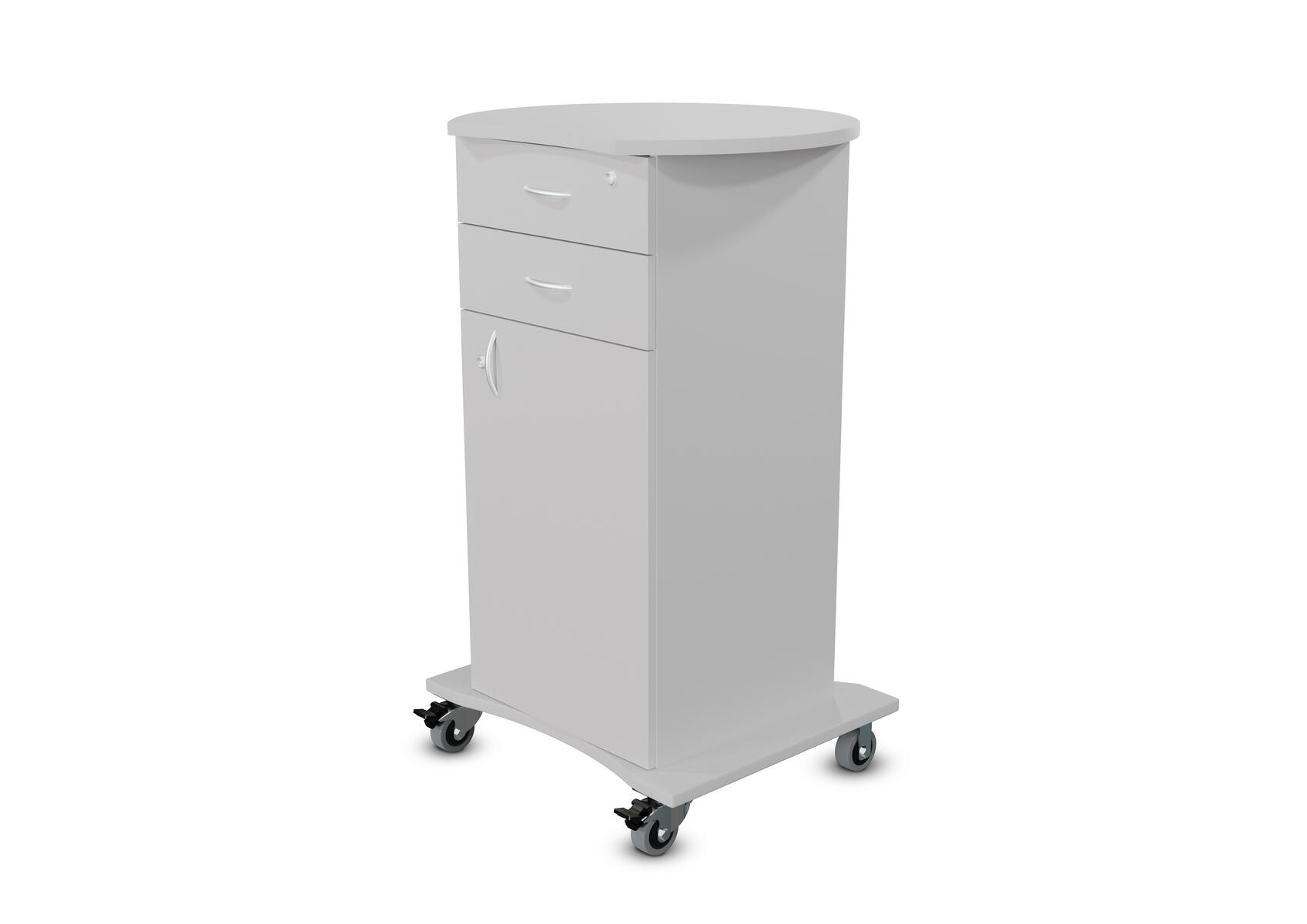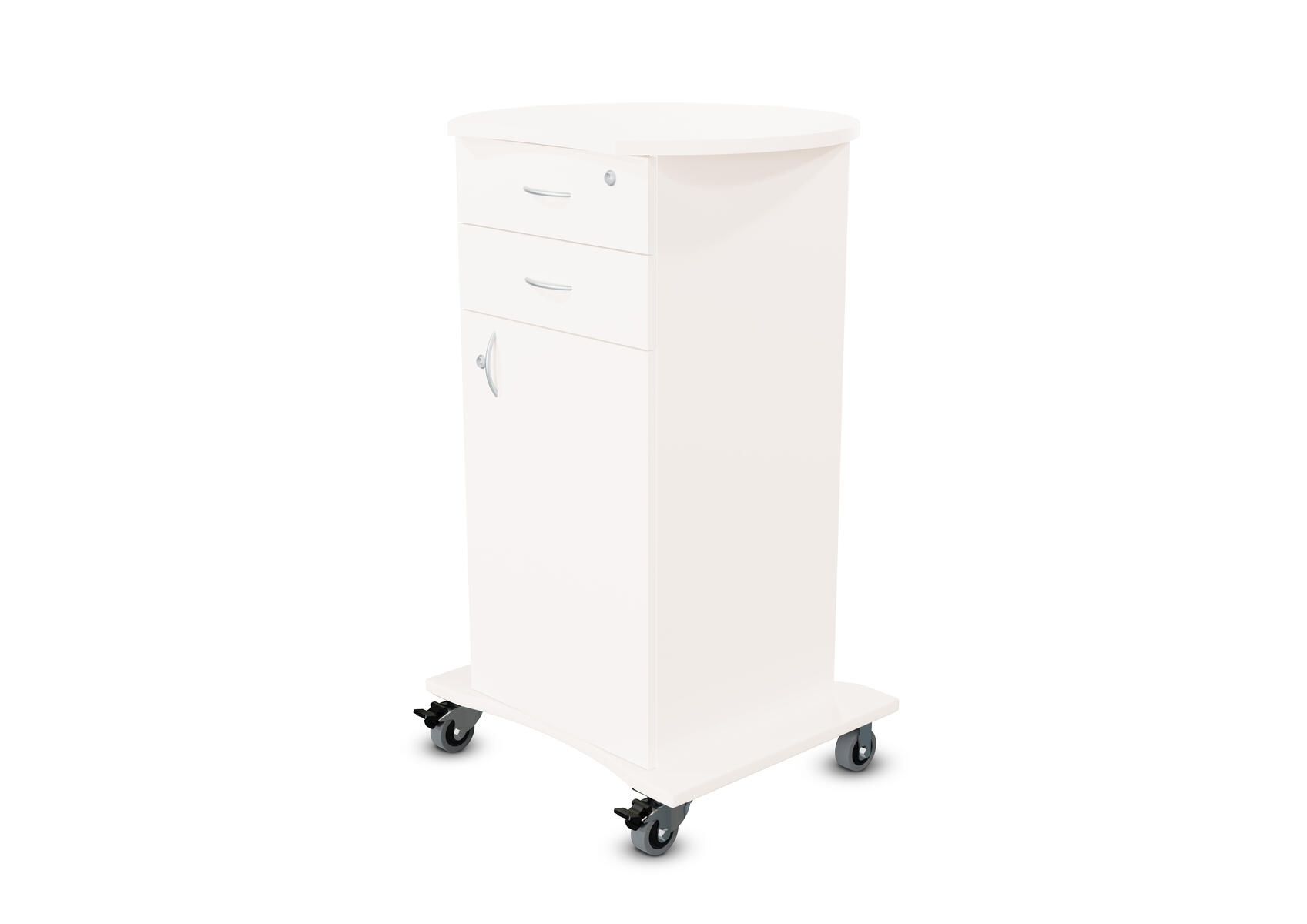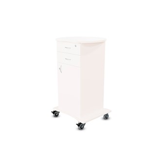 Vit stomme med val av färg på front och toppskiva. 2 fasta hjul och 2 roterbara hjul, lås på alla fyra hjulen. Höjd hjul 12 cm inklusive fäste. 2 nycklar vardera till låda, jalusi och dörr, totalt 6 nycklar. Handtag på låda, jalusi och dörr. Mått mellan låda och toppskiva: 18 cm. Toppskivans mått: 85x50 cm, tjocklek 25 mm. Lådor med stopp i framkant, ej soft close. Innermått översta lådan: B34xD34,5xH4 cm. Övriga lådor samma mått, men H7 cm. Spånskiva med melamin, tjocklek 18 mm. Front och toppskiva i högtryckslaminat.
