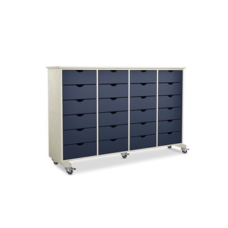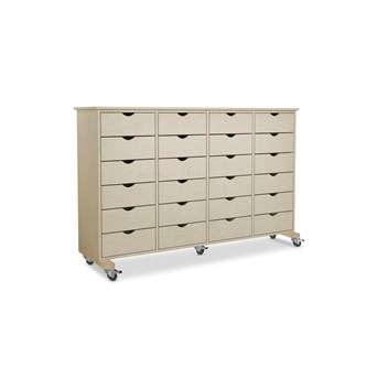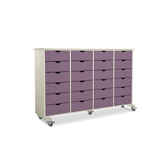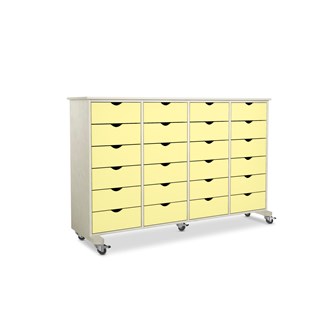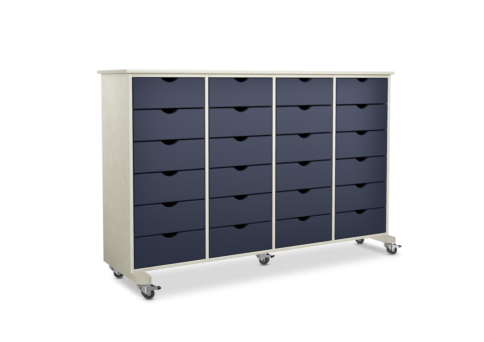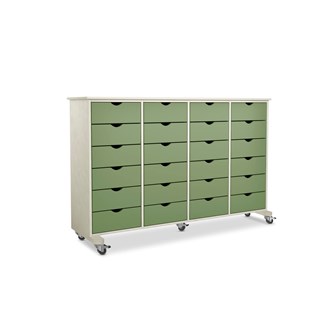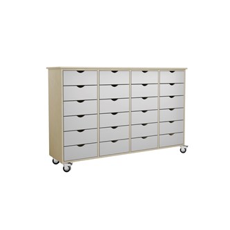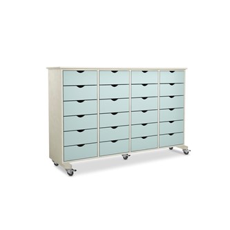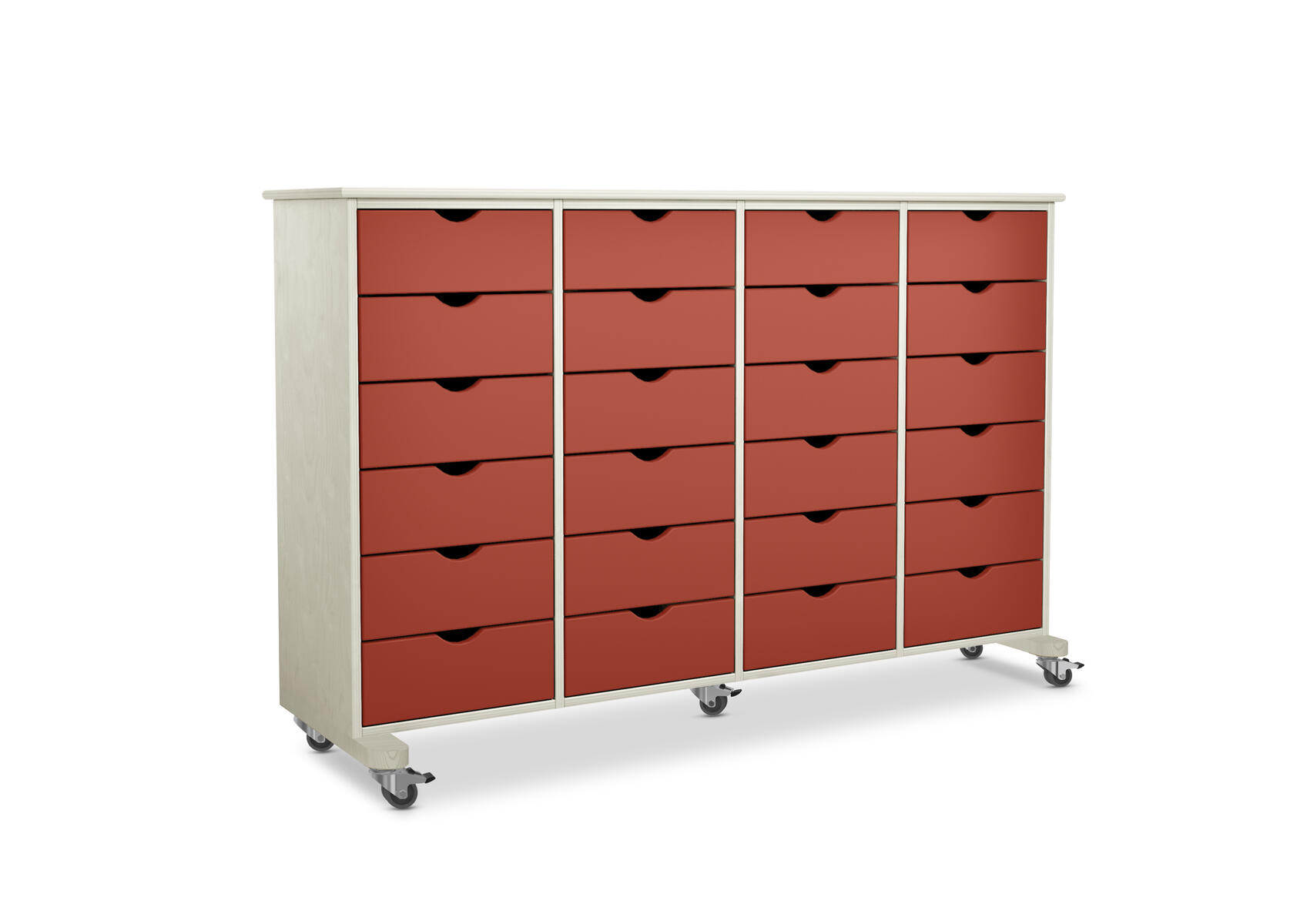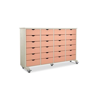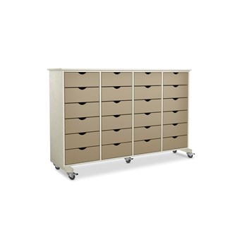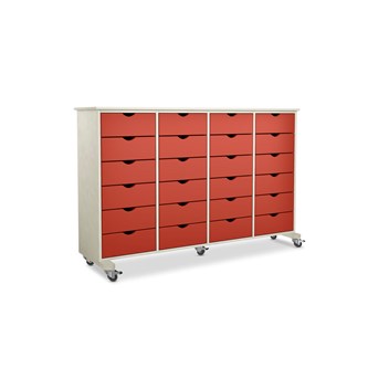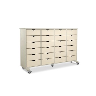 Passar utmärkt som rumsavdelare. Lådor på rullexpansion. Levereras med 5 hjul varav 4 på stödbenen. Mått: 150x37x100 cm. Invändiga mått lådor: B30xD32xH9,5 cm. Stödben sticker ut 7 cm. Tillverkas i 18 mm vitpigmenterad björkkryssfaner av högsta kvalitet. Mobila enheter ger en ökad flexibilitet och möjlighet att förändra rummets möblering. Vi vill dock göra er uppmärksamma på att hyllor och hurtsar på hjul innebär en ökad tipprisk, särskilt då enheten placeras fritt på golvet. Undvik att placera tunga föremål högt upp på hyllan. Låt inte barnen själva förflytta hyllan.