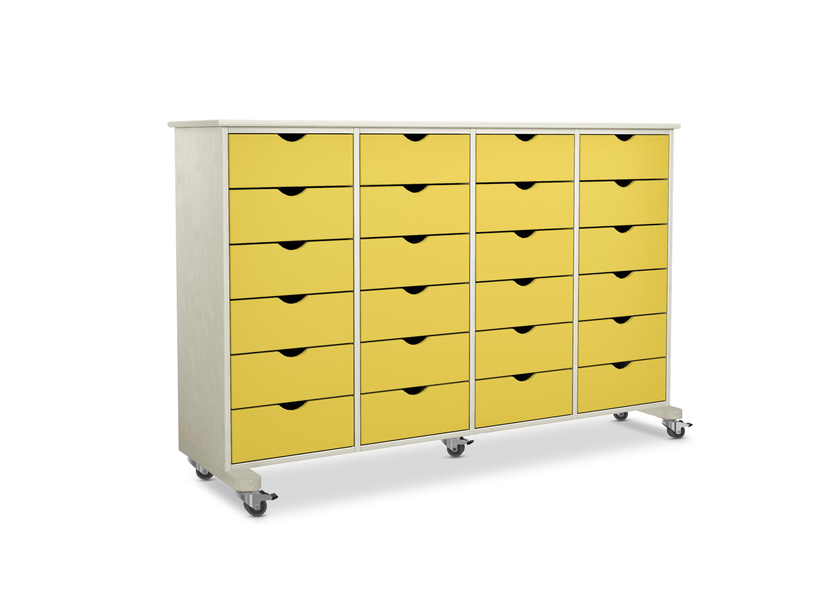 Passar utmärkt som rumsavdelare. Lådor på rullexpansion. Levereras med 5 hjul varav 4 på stödbenen. Mått: 113x37x100 cm. Invändiga mått lådor: B30xD32xH9,5 cm. Stödben sticker ut 7 cm. Tillverkas i 18 mm vitpigmenterad björkkryssfaner av högsta kvalitet. Mobila enheter ger en ökad flexibilitet och möjlighet att förändra rummets möblering. Vi vill dock göra er uppmärksamma på att hyllor och hurtsar på hjul innebär en ökad tipprisk, särskilt då enheten placeras fritt på golvet. Undvik att placera tunga föremål högt upp på hyllan. Låt inte barnen själva förflytta hyllan.