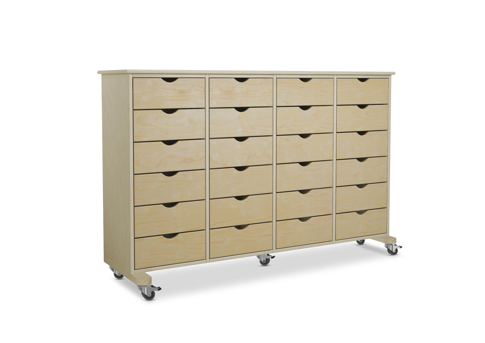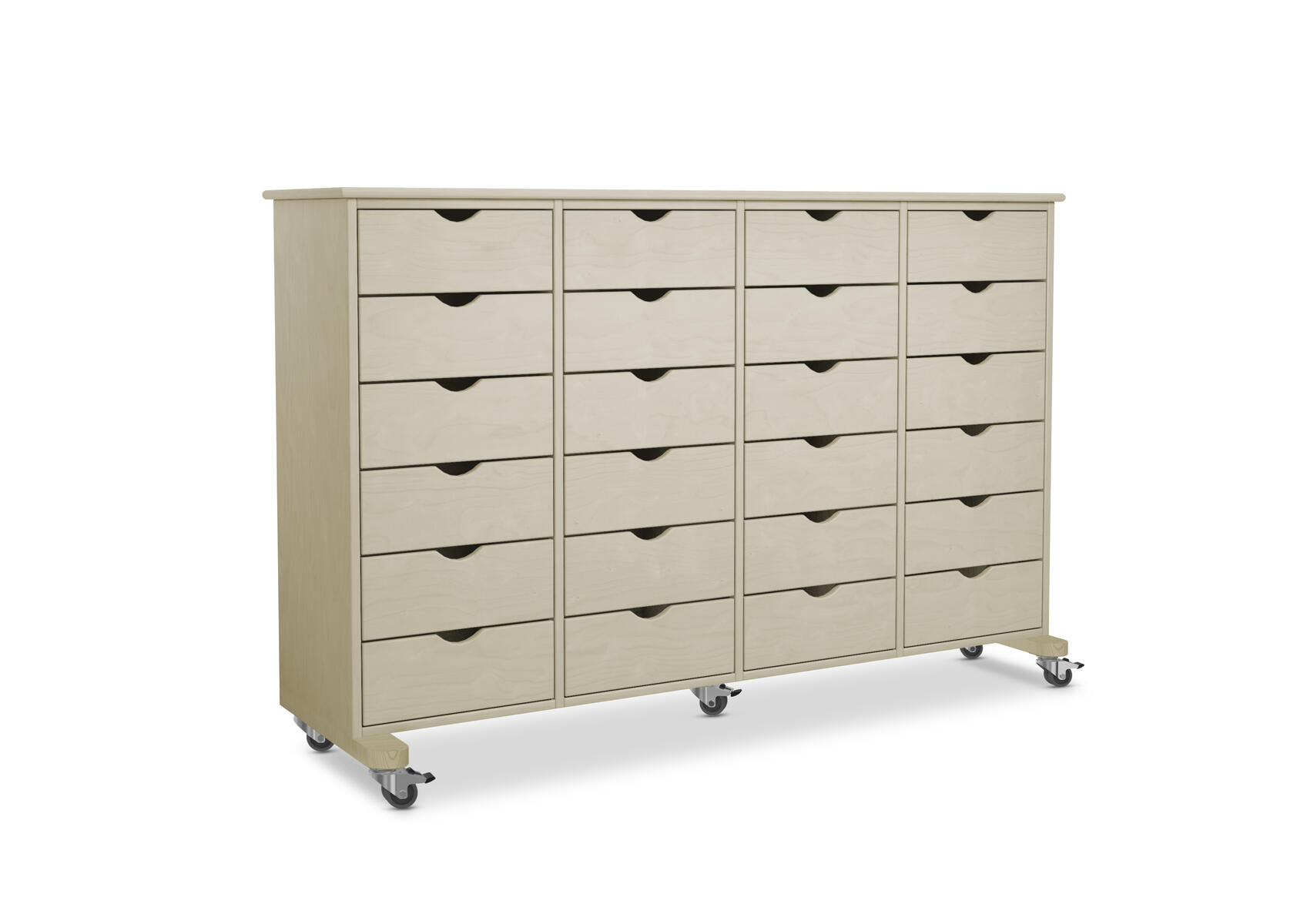 Passar utmärkt som rumsavdelare. Lådor på rullexpansion. Levereras med 5 hjul varav 4 på stödbenen. Mått: 150x37x100 cm. Invändiga mått lådor: B30xD32xH9,5 cm. Stödben sticker ut 7 cm. Tillverkas i 18 mm klarlackerad björkkryssfaner av högsta kvalitet. Mobila enheter ger en ökad flexibilitet och möjlighet att förändra rummets möblering. Vi vill dock göra er uppmärksamma på att hyllor och hurtsar på hjul innebär en ökad tipprisk, särskilt då enheten placeras fritt på golvet. Undvik att placera tunga föremål högt upp på hyllan. Låt inte barnen själva förflytta hyllan.