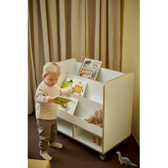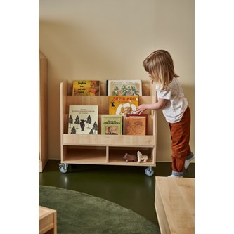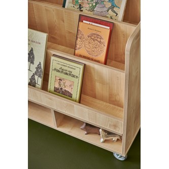Enkelsidig bokvagn gjord i 18 mm spånskiva med laminat. Kantband i plywoodlook. Fyra hjul varav två är låsbara och rörliga, två fasta. Totalhöjd 80 cm. Höjd framkant hylla 8 cm. Höjd bakkant på de två främre hylla 23 cm. Översta bakkanten är 18 cm. Djup varje hylla 12 cm. Fackmått nederst 14,5 cm hög, bredd 37 cm. 40,5 djup.