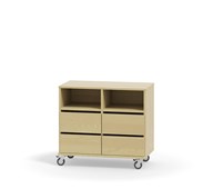 Svea elevförvaring på hjul, 6 lådor. Levereras färdigmonterad. 4 hjul varav två är rörliga och med lås på ena kortsidan. De andra två är fasta, vilket gör förvaringen stabil vid förflyttning. Lådor har en smal öppning som agerar postfack och öppnare. Material 18 mm spånskiva med laminat. Kantband i ABS. Bottenplatta D44,5 cm. Lådmått: Mått front: B38,5xH övre 18 cm och nedre 17 cm. Lådans innermått: B34xD33,5xH10 cm.