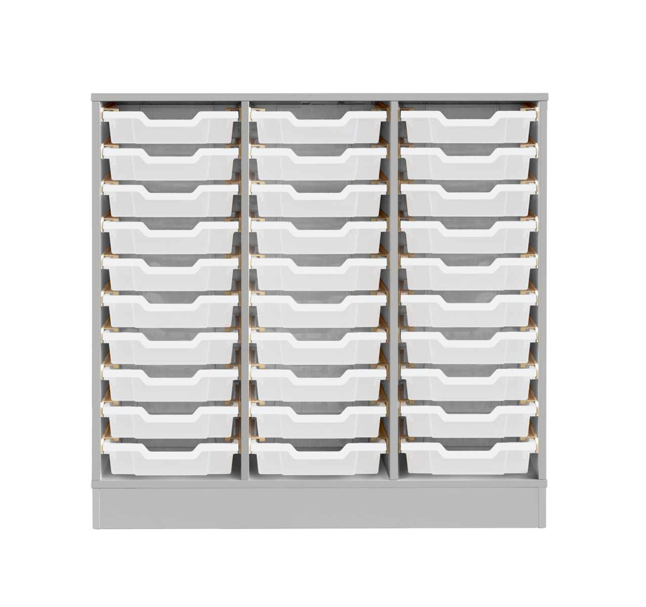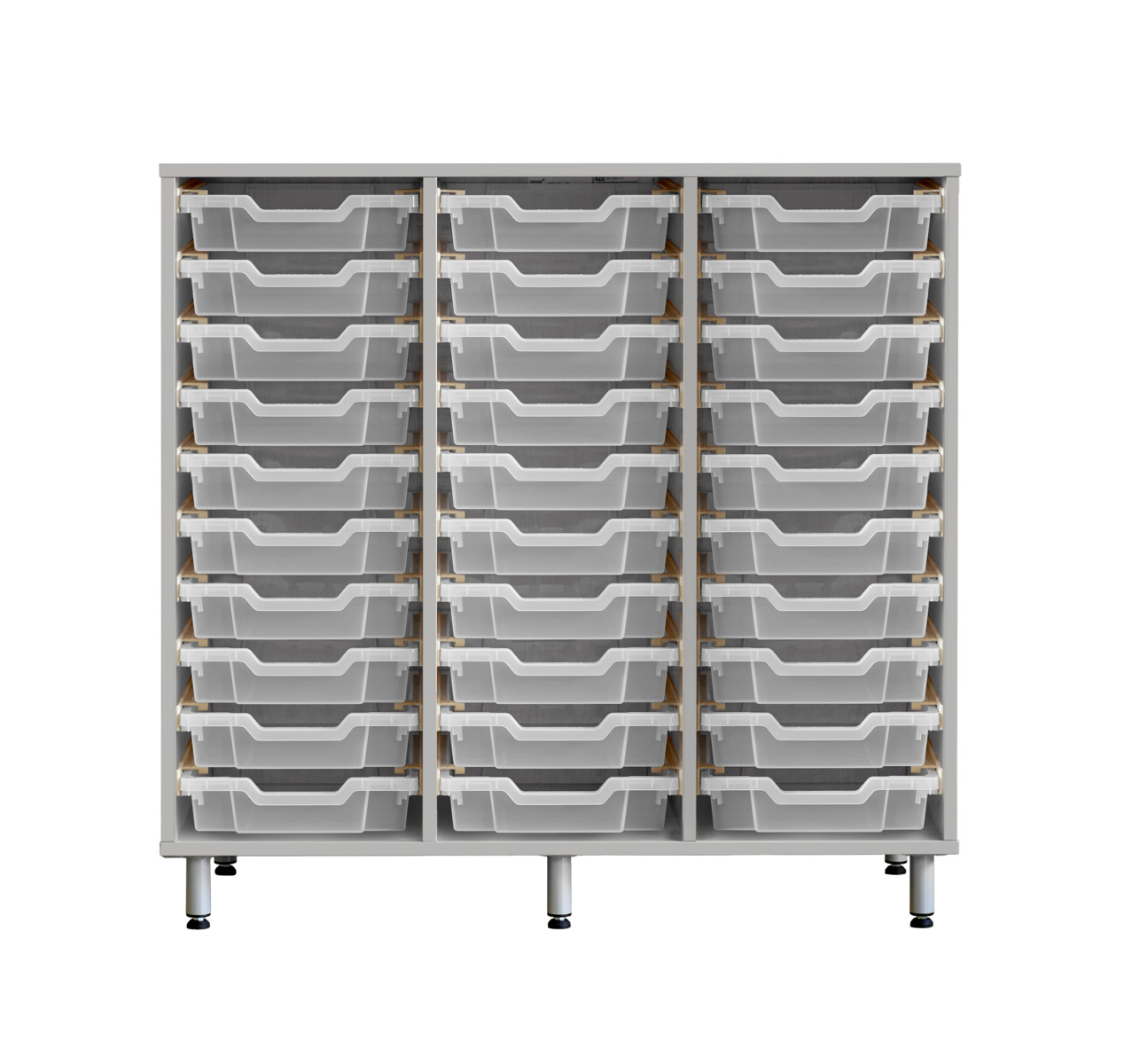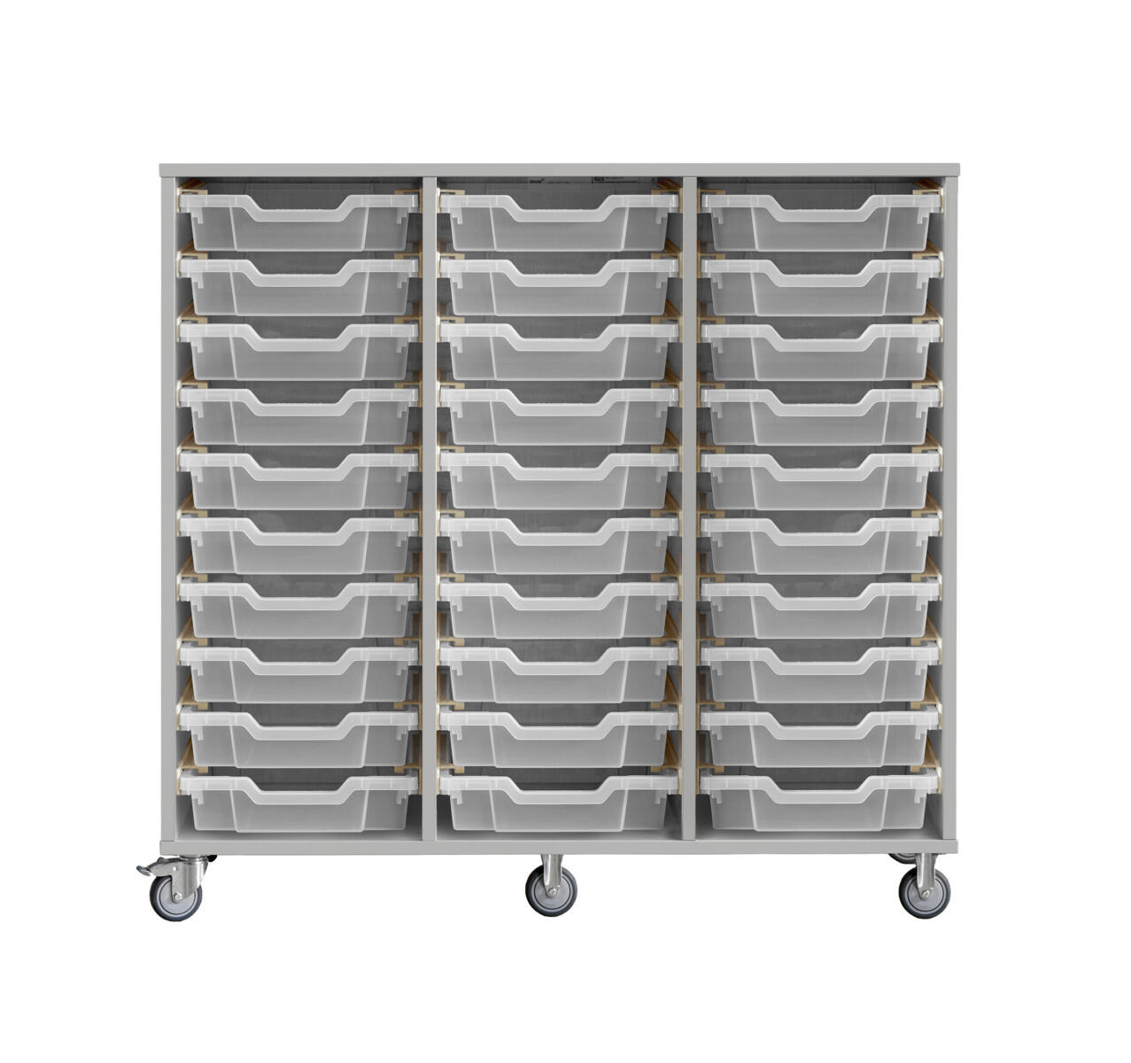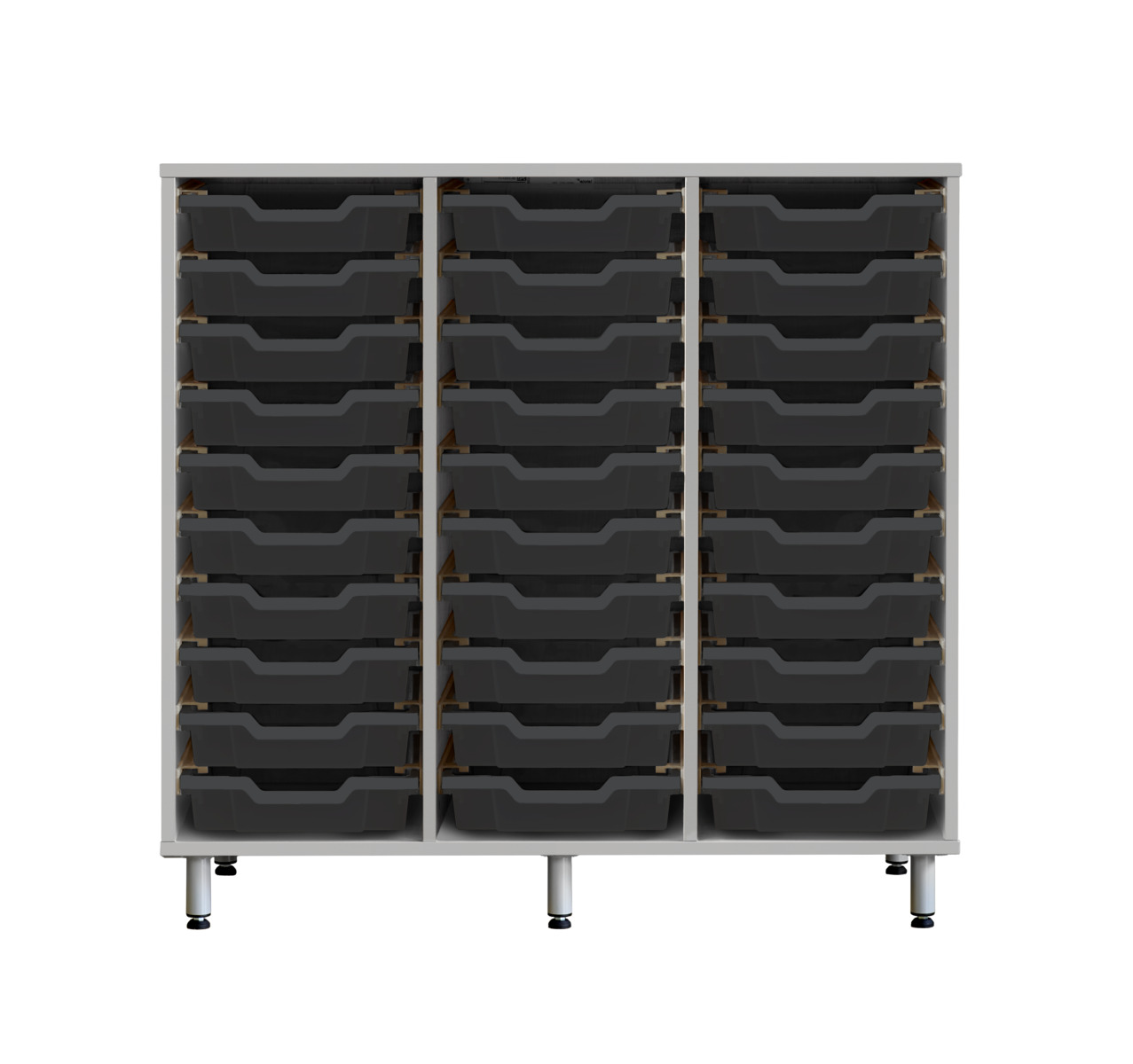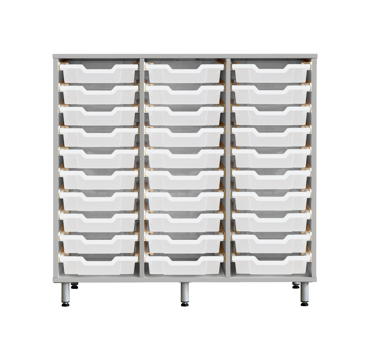Komplett förvaringshylla med backar från Gratnell. Vid val av hjul: 4 hjul varav 2 är fasta, vilket gör förvaringen stabil vid förflyttning. De rörliga har lås. Material 18 mm spånskiva med laminat med kantband i ABS. Stomme med ben och sockel ska fästas i vägg med medföljande väggbeslag. Skruv för detta ingår inte. Skena med stopp till back. Mått back: B31,2xD42,7xH7,5 cm. Välj färg på back.