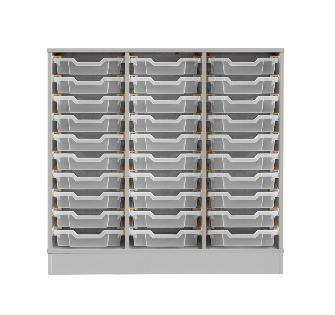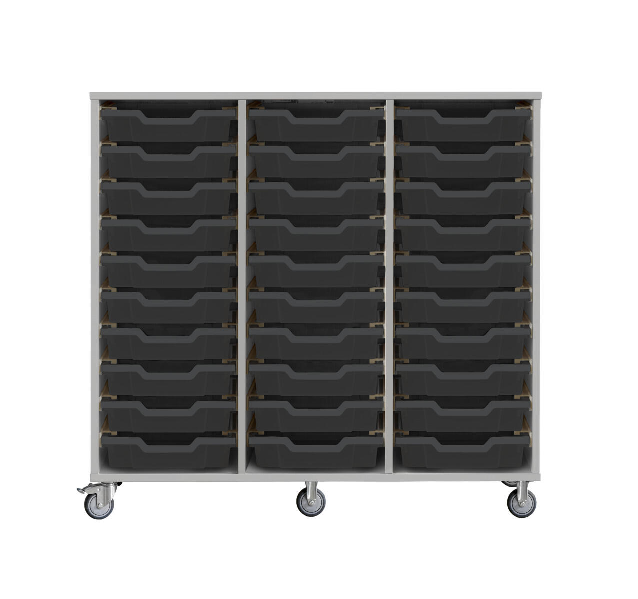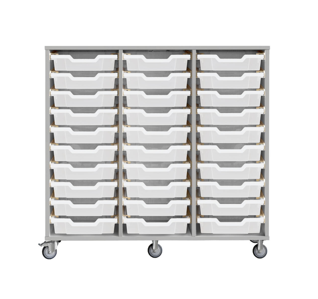 Komplett förvaringshylla med backar från Gratnell. Vid val av hjul: 6 hjul varav 2 är fasta, vilket gör förvaringen stabil vid förflyttning. De rörliga har lås. Material 18 mm spånskiva med laminat med kantband i ABS. Stomme med ben och sockel ska fästas i vägg med medföljande väggbeslag. Skruv för detta ingår inte. Skena med stopp till back. Mått back: B31,2xD42,7xH7,5 cm. Välj färg på back.