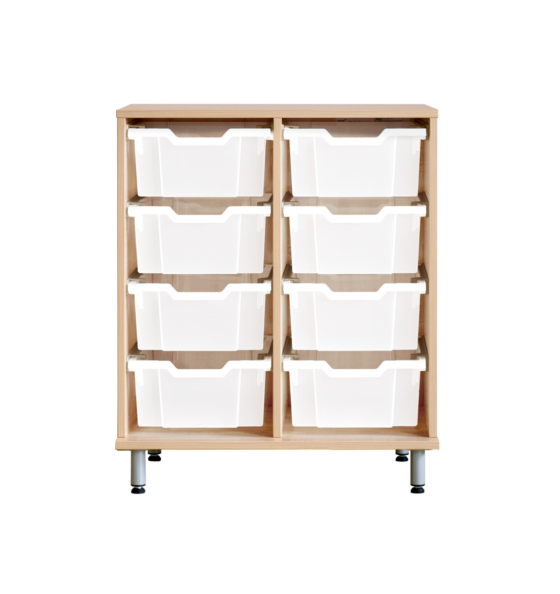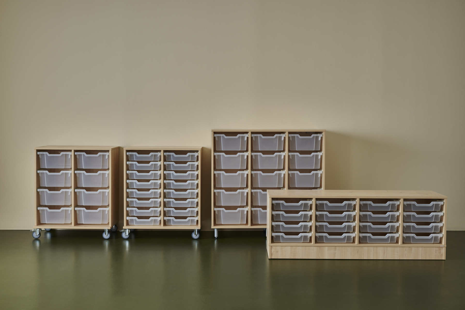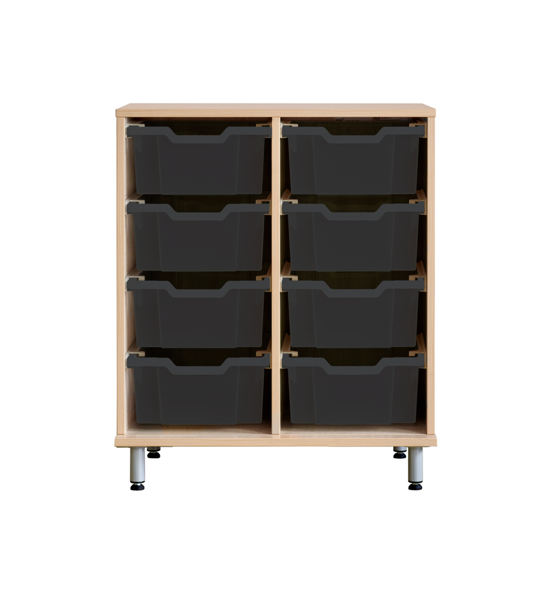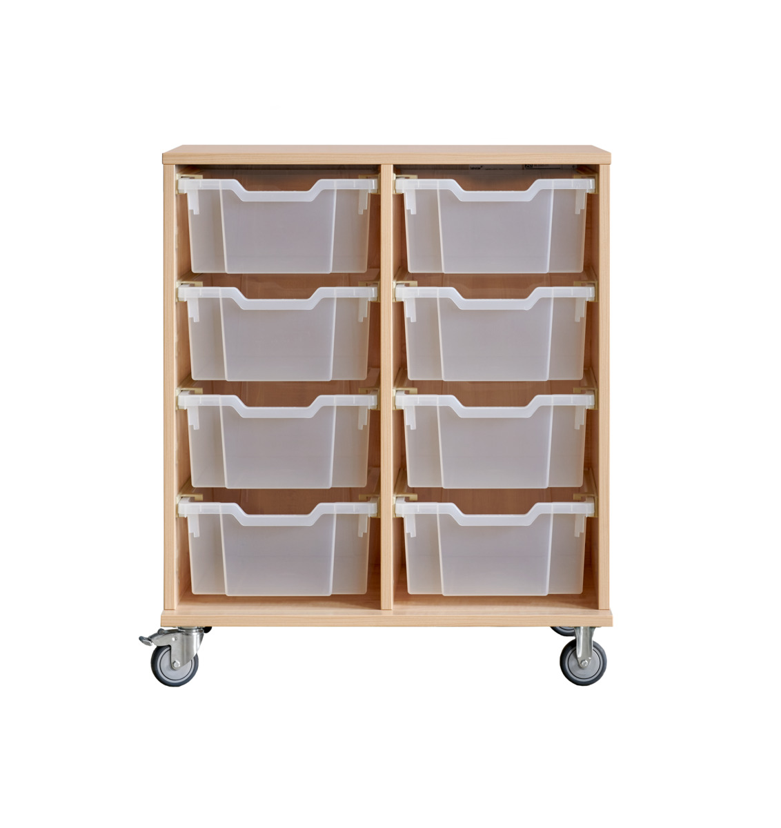 Komplett förvaringshylla med backar från Gratnell. Vid val av hjul: 6 hjul varav 2 är fasta, vilket gör förvaringen stabil vid förflyttning. De rörliga har lås. Material 18 mm spånskiva med laminat med kantband i ABS. Stomme med ben och sockel ska fästas i vägg med medföljande väggbeslag. Skruv för detta ingår inte. Skena med stopp till back. Mått back: B31,2xD42,7xH7,5 cm. Välj färg på back.