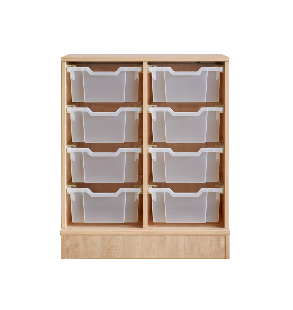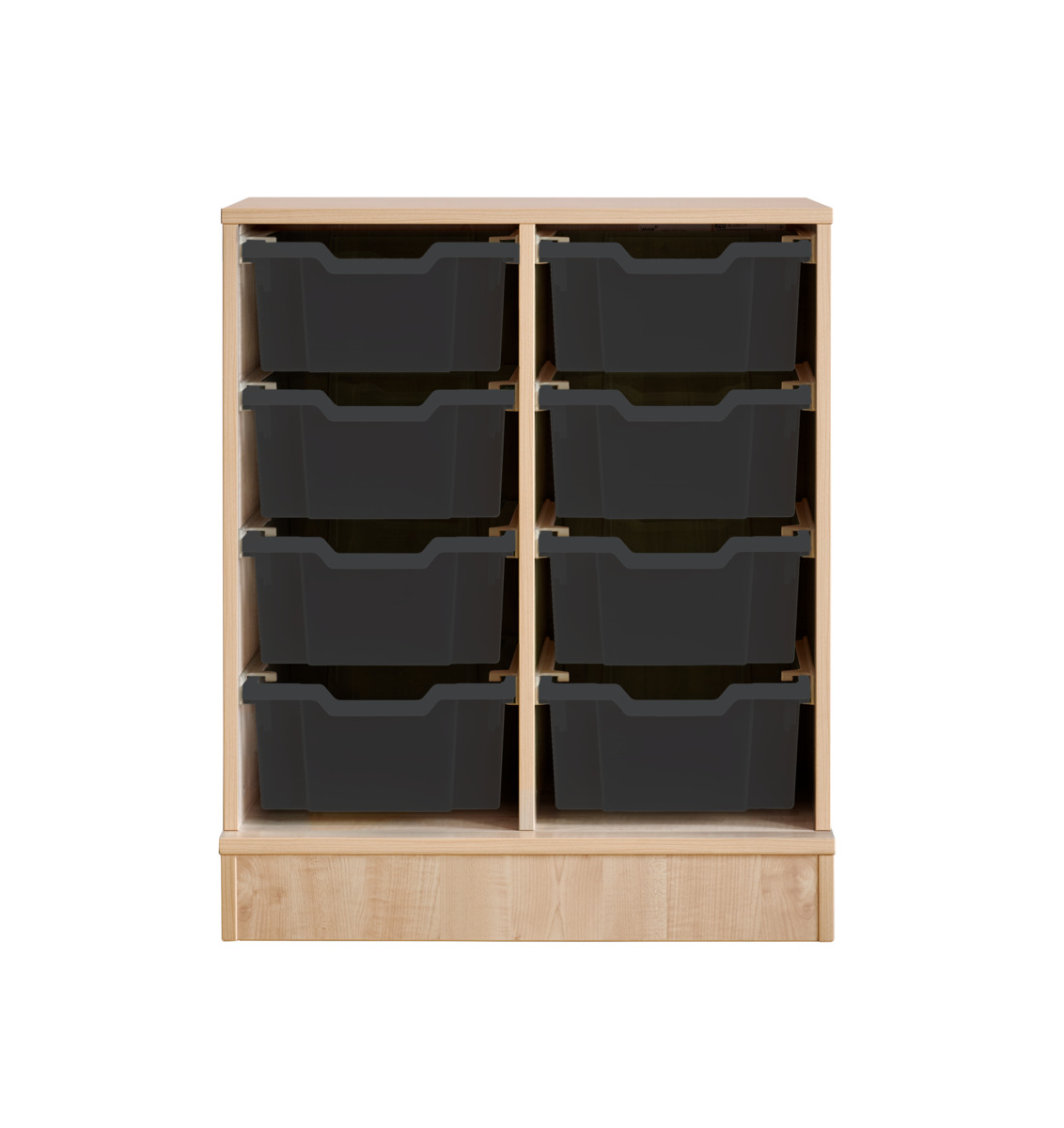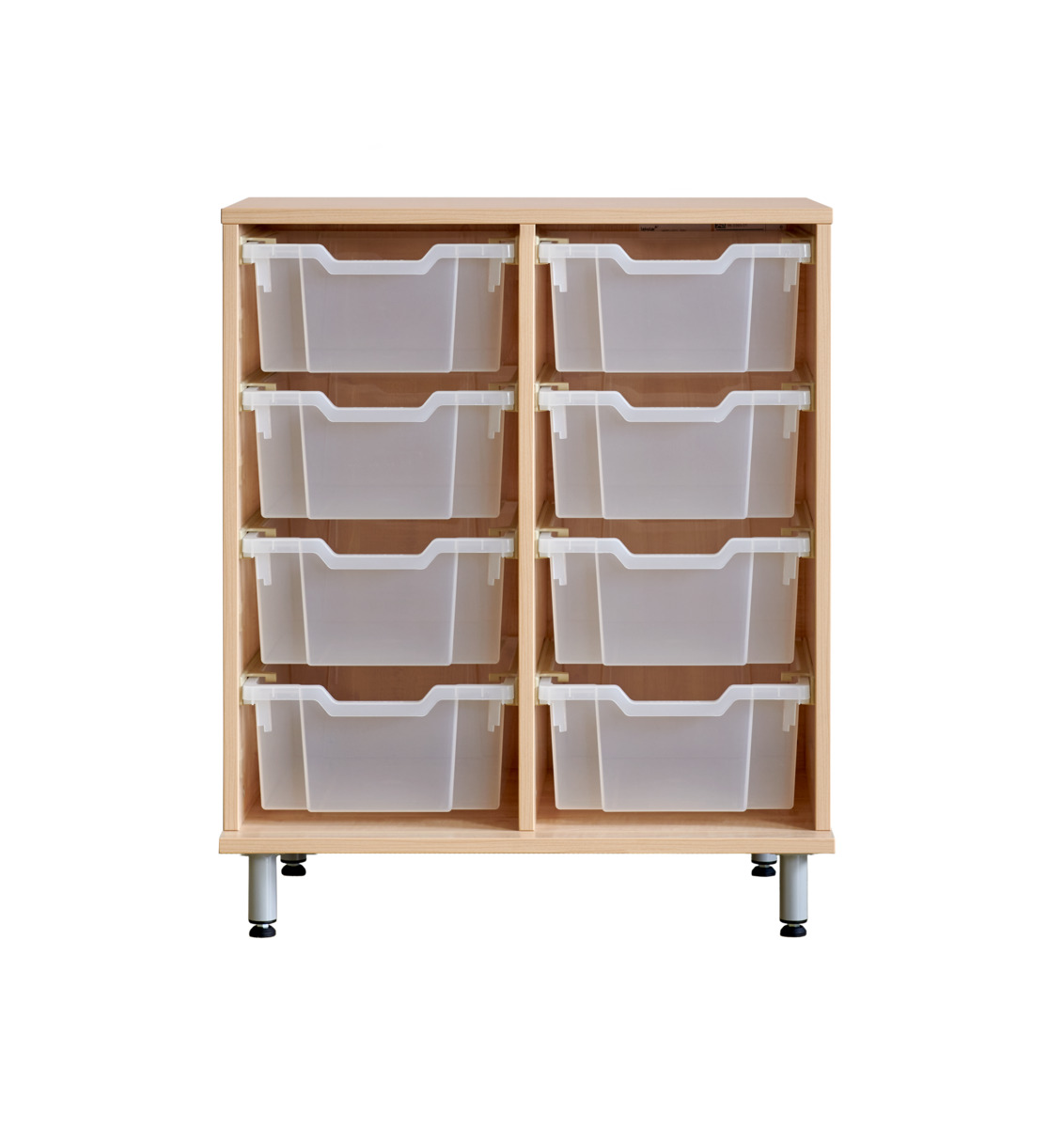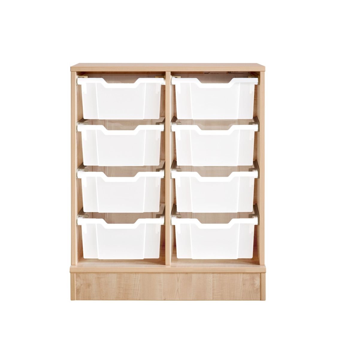 Komplett förvaringshylla med backar från Gratnell. Vid val av hjul: 6 hjul varav 2 är fasta, vilket gör förvaringen stabil vid förflyttning. De rörliga har lås. Material 18 mm spånskiva med laminat med kantband i ABS. Stomme med ben och sockel ska fästas i vägg med medföljande väggbeslag. Skruv för detta ingår inte. Skena med stopp till back. Mått back: B31,2xD42,7xH7,5 cm. Välj färg på back.
