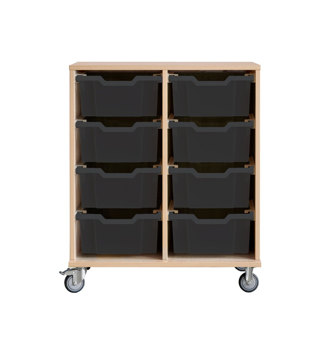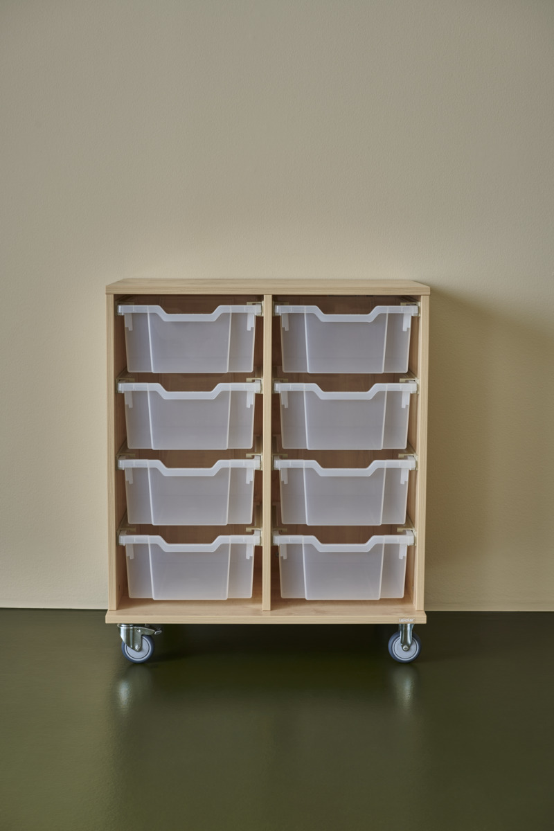 Svea elevförvaring på hjul, 9 lådor. Levereras färdigmonterad. 5 hjul varav tre är rörliga och med lås på ena kortsidan. De andra två är fasta, vilket gör förvaringen stabil vid förflyttning. Lådor har en smal öppning som agerar postfack och öppnare. Material 18 mm spånskiva med laminat. Kantband i ABS. Bottenplatta D44,5 cm. Lådmått: Mått front: B38,5xH övre 18 cm och nedre 17 cm. Lådans innermått: B34xD33,5xH10 cm.