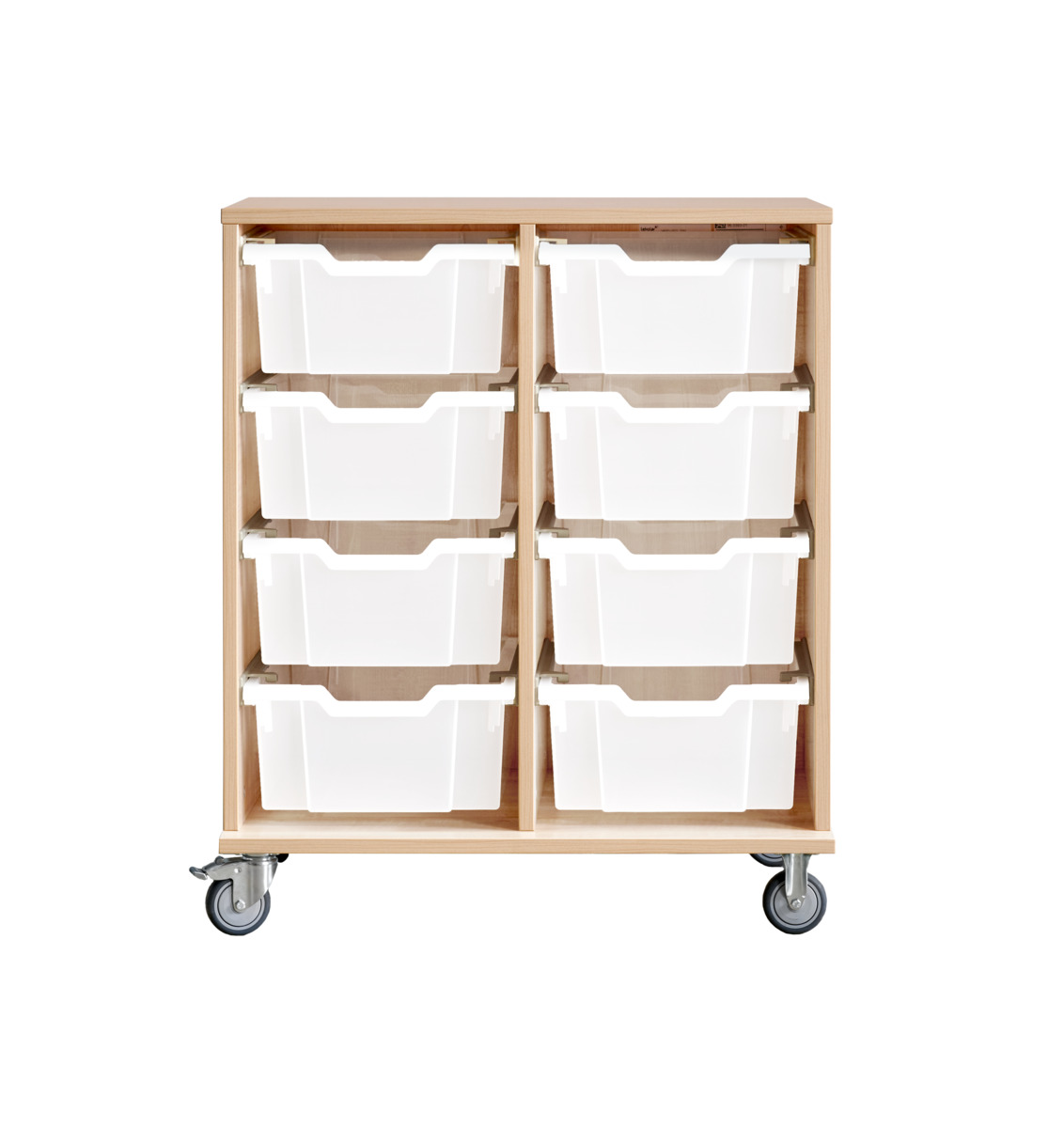 Svea elevförvaring på hjul, 18 små lådor. Levereras färdigmonterad. 5 hjul varav tre är rörliga och med lås på ena kortsidan. De andra två är fasta, vilket gör förvaringen stabil vid förflyttning. Lådor har en smal öppning som agerar postfack och öppnare. Material 18 mm spånskiva med laminat. Kantband i ABS. Bottenplatta D44,5 cm. Lådmått: 117190: Mått front: B38,5xH övreoch mitt 11 cm, nedre 13 cm. Lådans innermått: B34xD33,5xH7 cm. 120057: Mått front: B38,5xH övre 18 cm och nedre 17 cm. Lådans innermått: B34xD33,5xH7 cm.