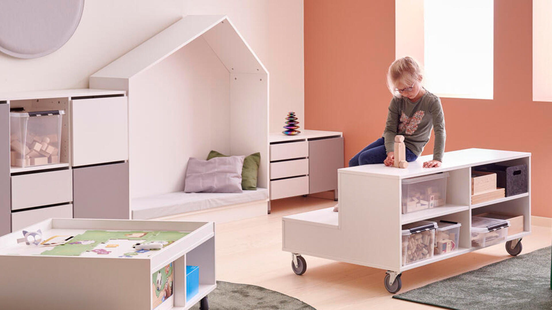 Svea gradäng har 4 roterbara hjul varav de 2 bakre är låsbara. Öppning på baksida för praktisk förvaring. Tillverkad av 18 mm spånskiva med FSC-certifierad melamin. Hjul bygger 12 cm i höjd. Mått: B120xD80xH59 cm, varje trappsteg D40. Höjd från golv till första trappsteg 30 cm, från nedersta trappsteg till översta 28 cm. Innerfackens höjd 20 cm. Djup nedersta fack 78 cm, översta 38 cm. Bredd fack 57 cm.