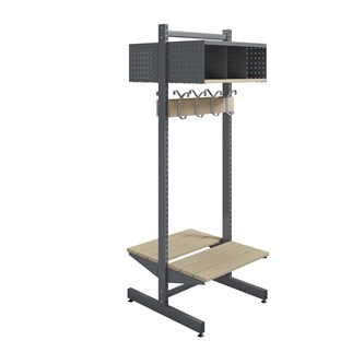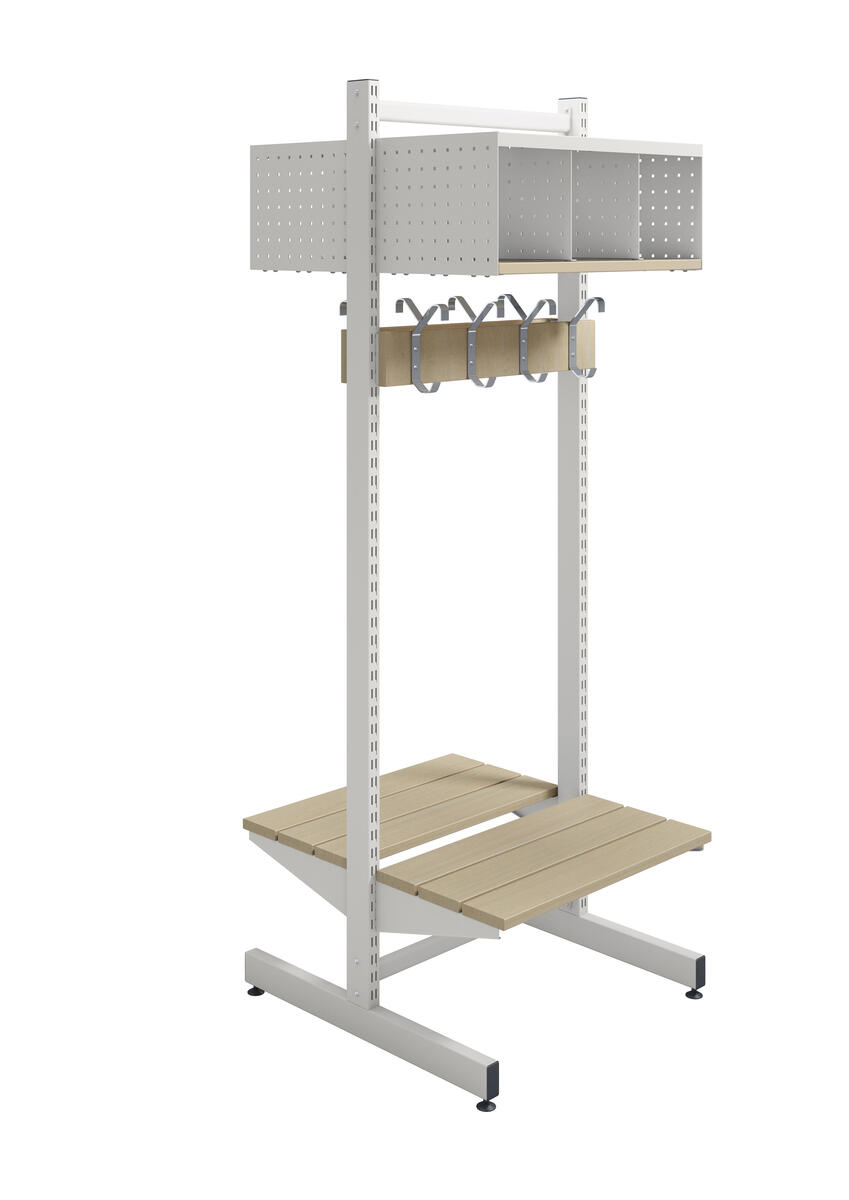 Denna kombination består av 1 T-stativ, 2 klädfack med 3 fack vardera i perforerad plåt och hyllplan i massivt trä. Även de två kroklisterna samt sittbänkarna består av massivt trä. 4 st krokar per kroklist. Bredd: 60 cm.