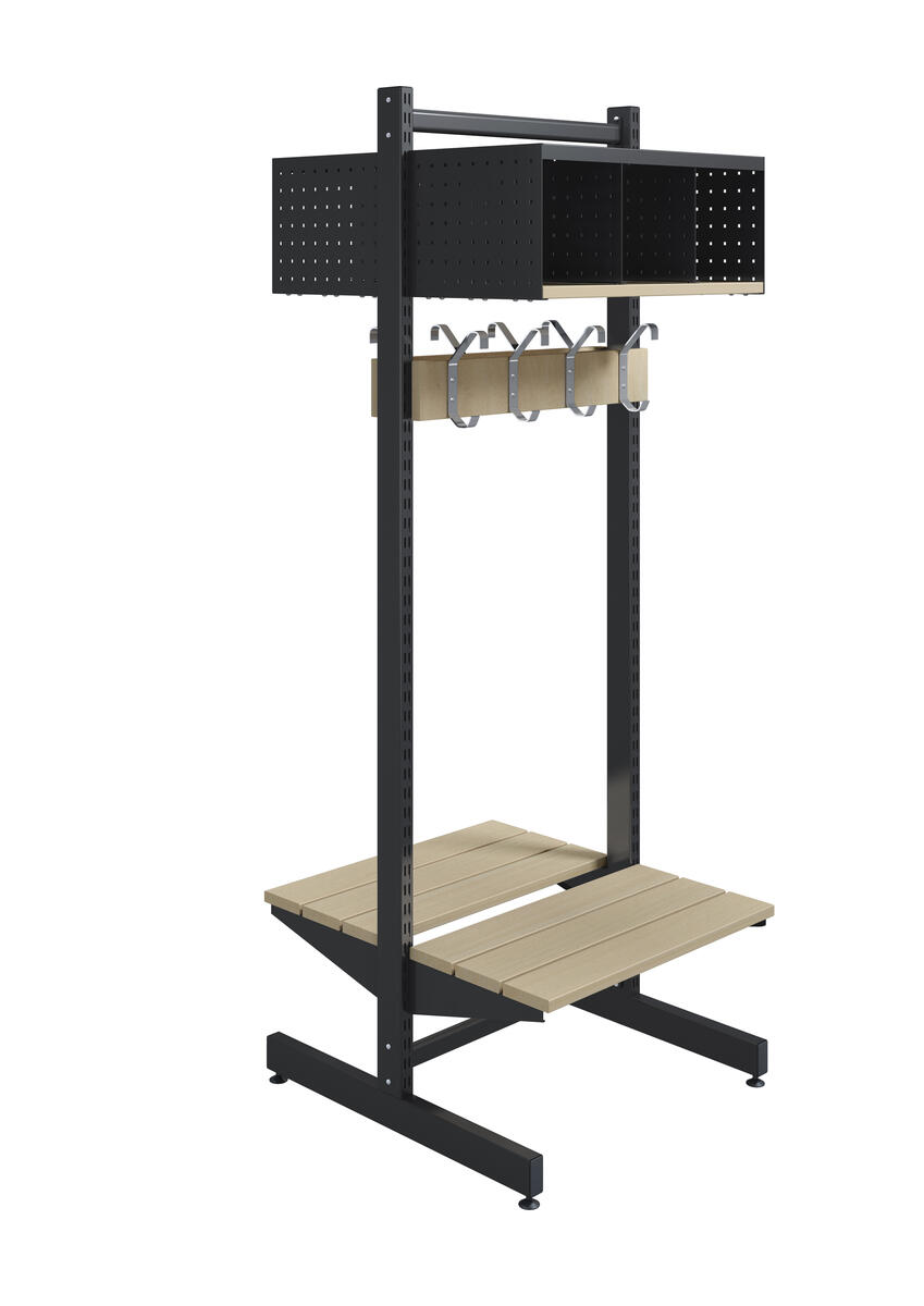 Denna kombination består av 1 T-stativ, 2 klädfack med 2 fack vardera i perforerad plåt och hyllplan i massivt trä. Även de två kroklisterna samt sittbänkarna består av massivt trä. Bredd: 60 cm.