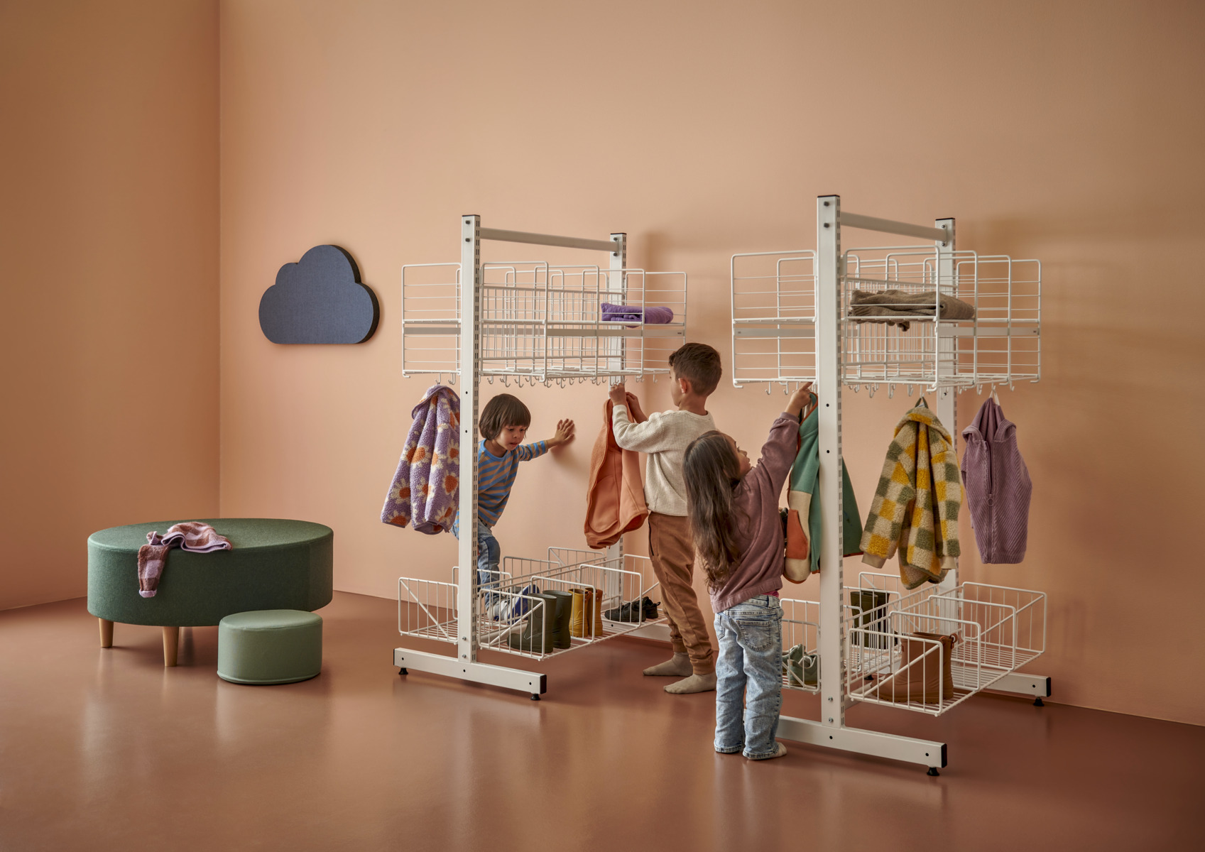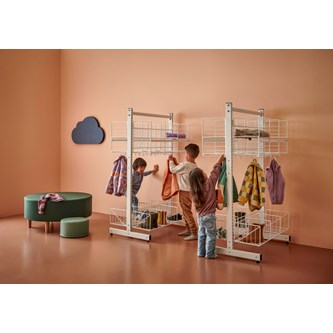 Denna kombination består av 1 T-stativ, 2 klädfack med 2 fack vardera i perforerad plåt och hyllplan i massivt trä. Även de två kroklisterna samt sittbänkarna består av massivt trä. Bredd: 60 cm.