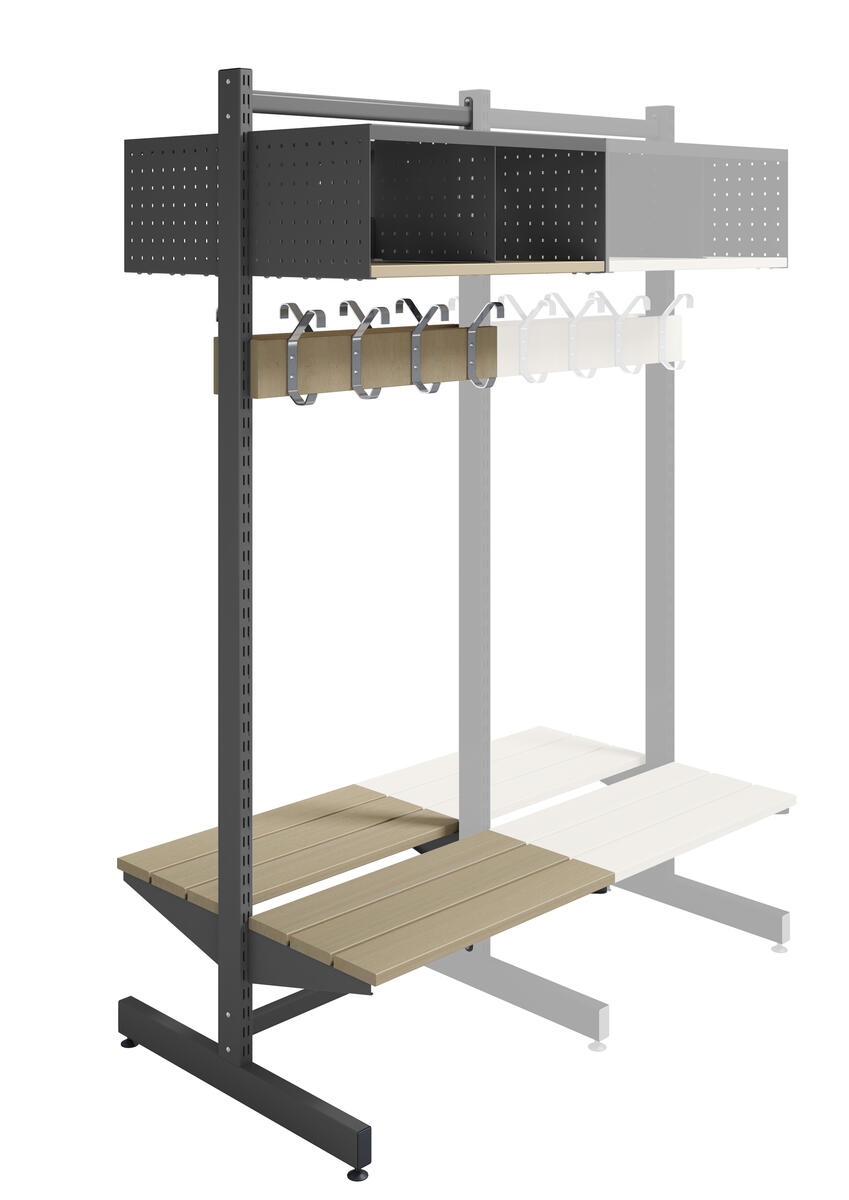 Denna kombination består av 1 T-stativ, 2 klädfack med 2 fack vardera i perforerad plåt och hyllplan i massivt trä. Även de två kroklisterna samt sittbänkarna består av massivt trä. Bredd: 60 cm.