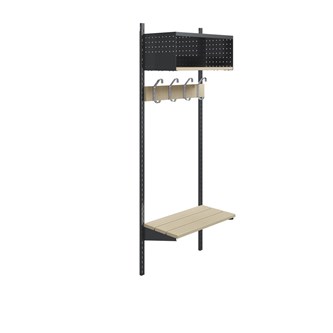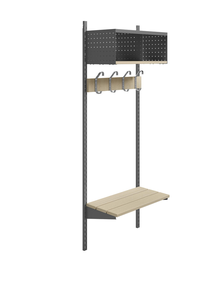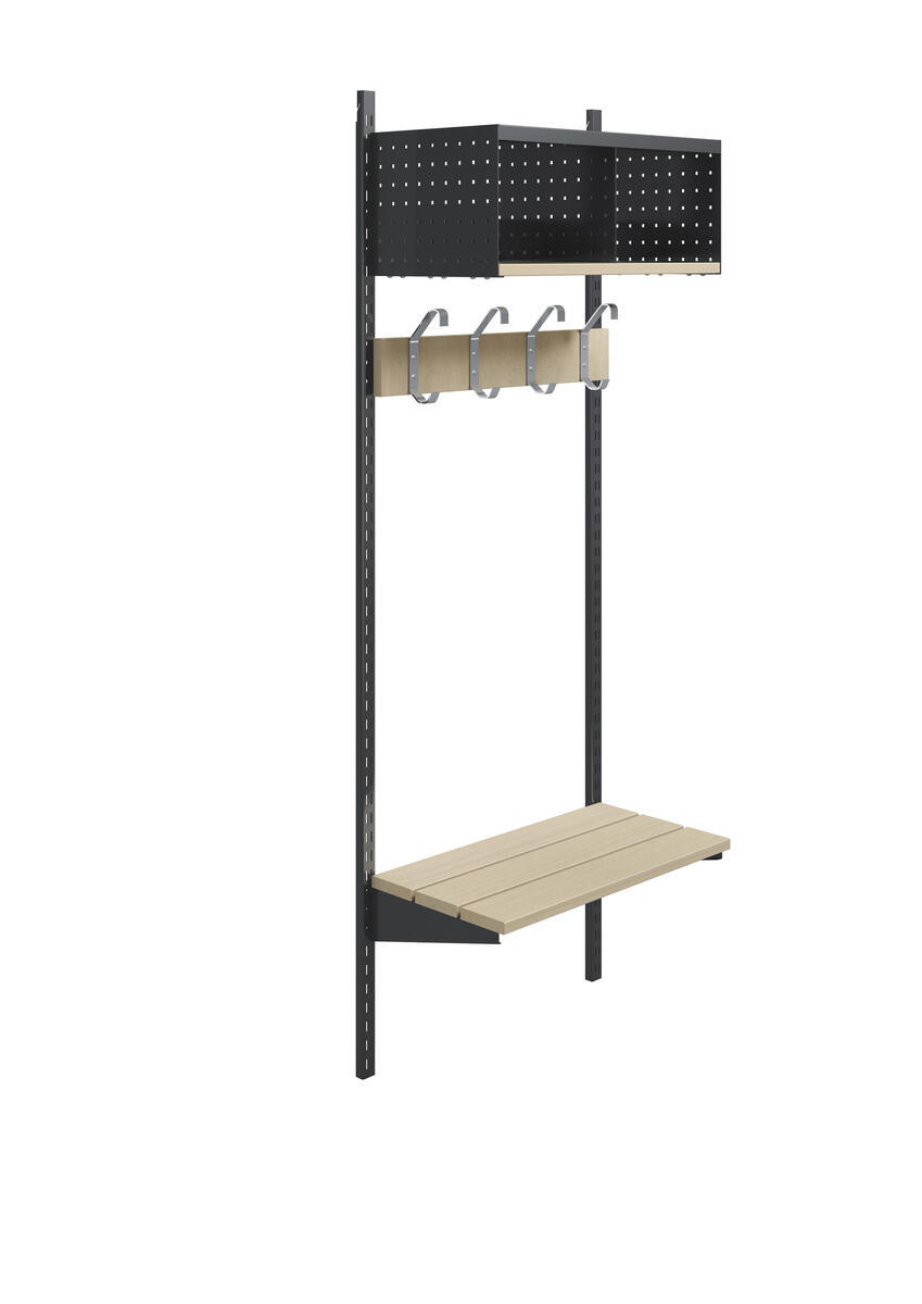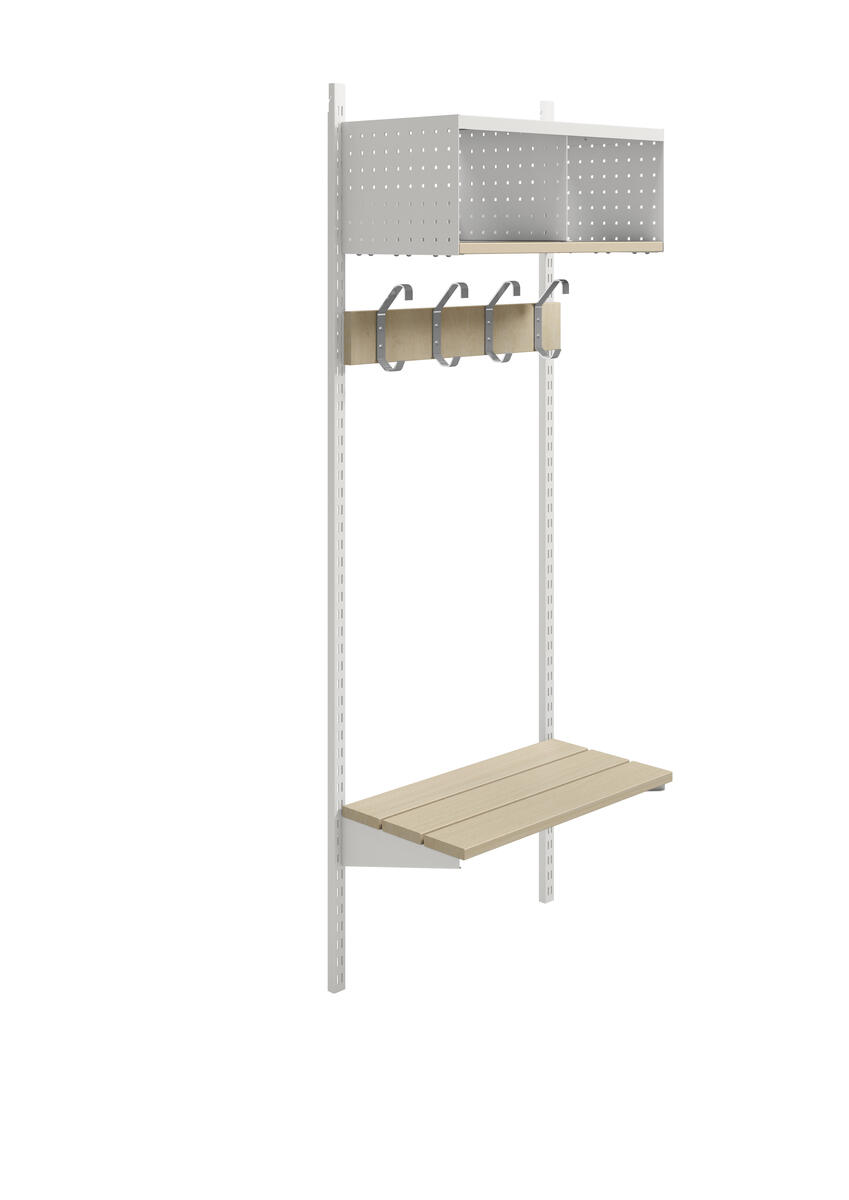 Denna kombination består av 2 väggskenor, 1 klädfack med 2 fack i perforerad plåt och hyllplan i massivt trä. Även kroklisten och sittbänken består av massivt trä. Den kan enkelt kompletteras med andra komponenter ur Willesystemet. Bredd: 60 cm.