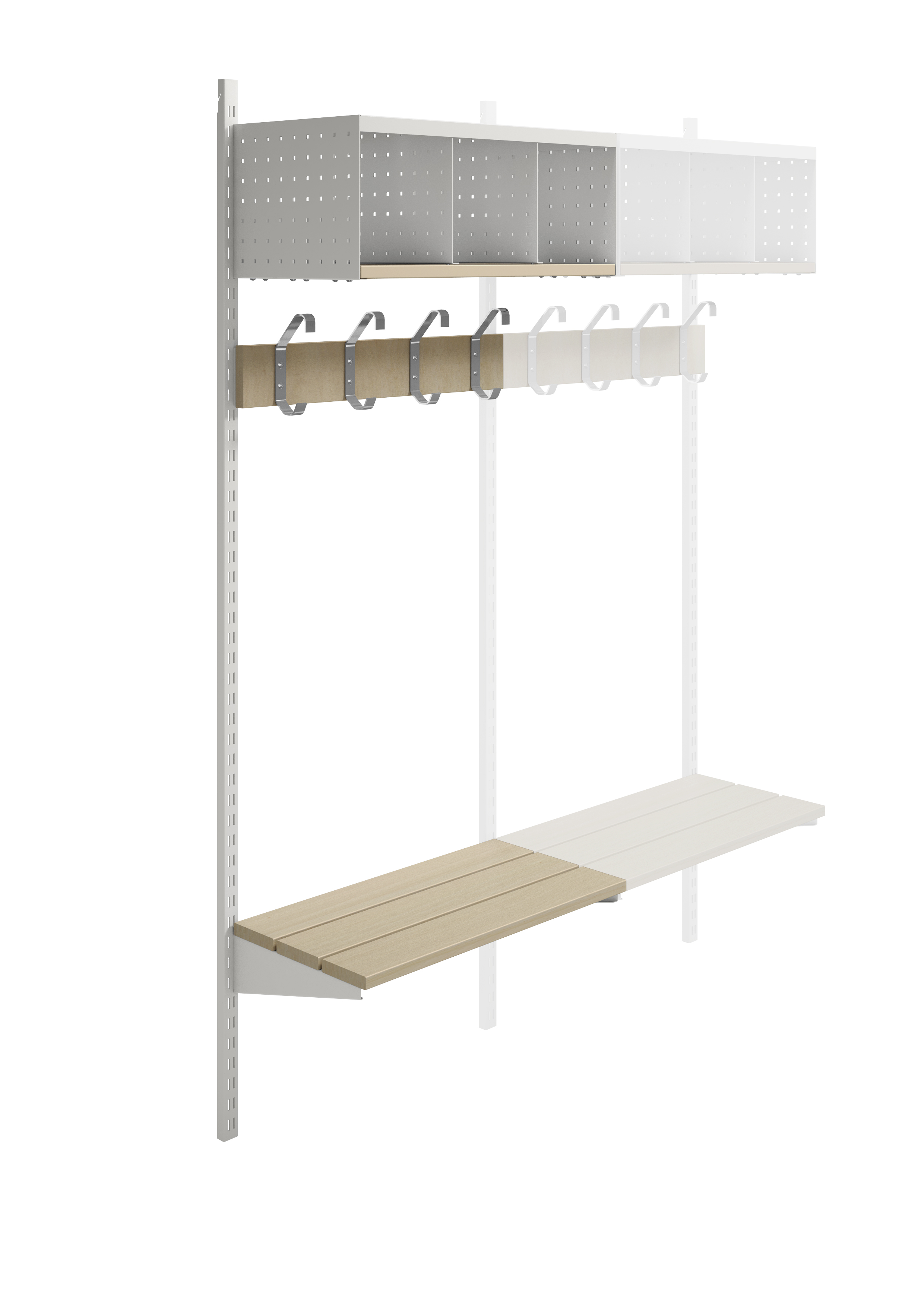 Denna kombination består av 2 väggskenor, 1 klädfack med 3 fack i perforerad plåt med hyllplan i massivt trä. Även kroklisten och sittbänken består av massivt trä. Den kan enkelt kompletteras med andra komponenter ur Willesystemet. Bredd: 60 cm.