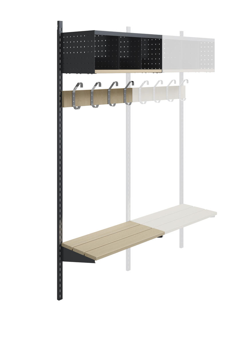 Denna kombination består av 2 väggskenor, 1 klädfack med 2 fack i perforerad plåt och hyllplan i massivt trä. Även kroklisten och sittbänken består av massivt trä. Den kan enkelt kompletteras med andra komponenter ur Willesystemet. Bredd: 60 cm.