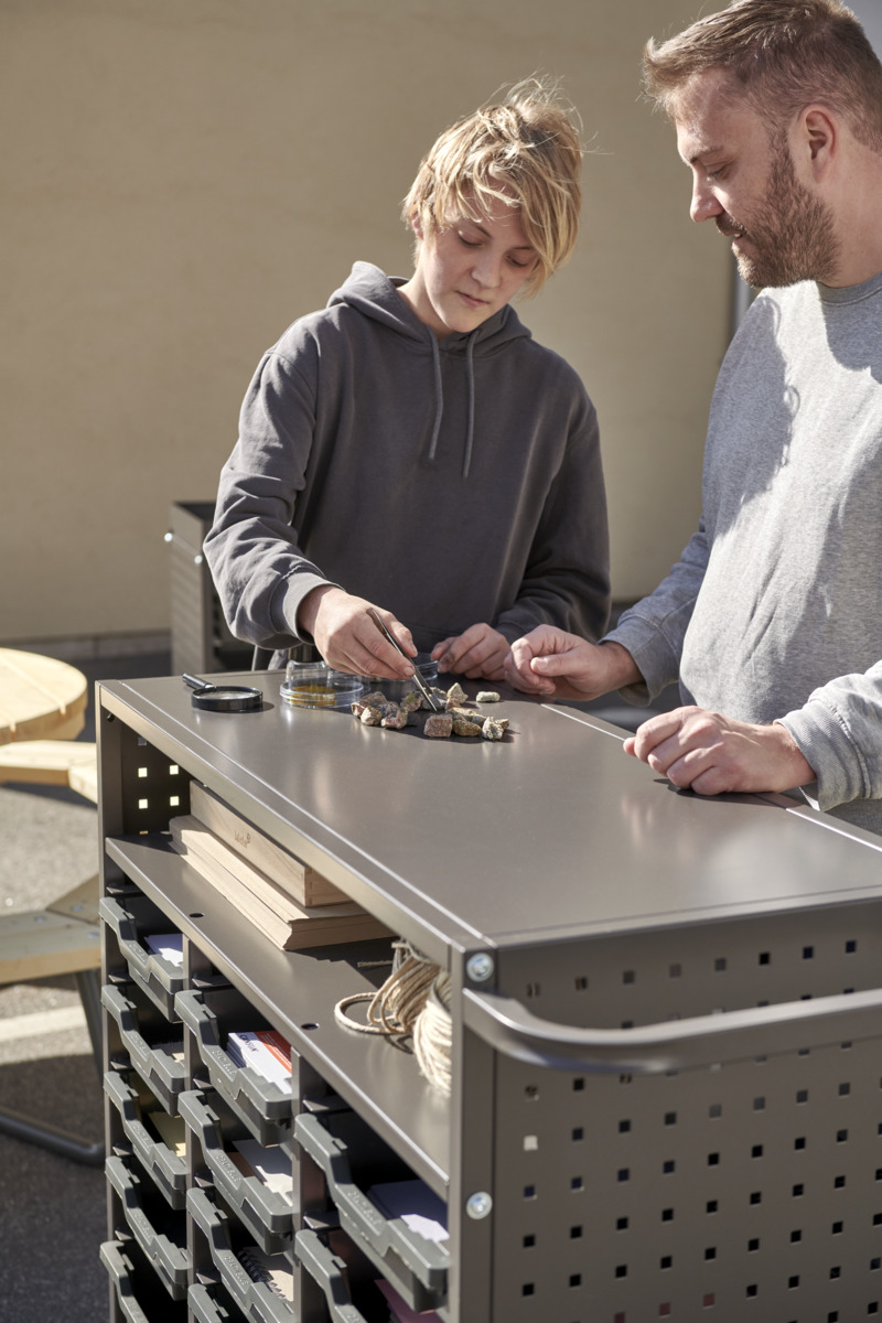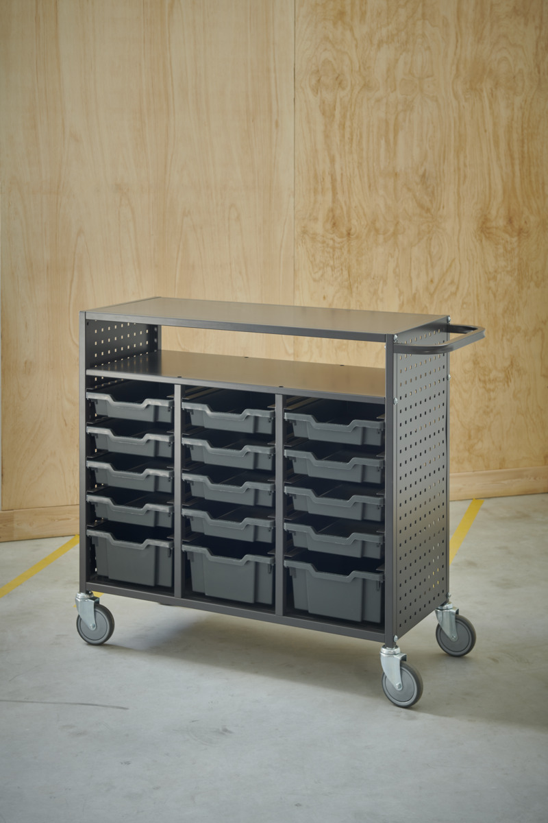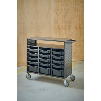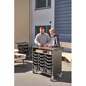 En smidig och flexibel materialvagn med förvaringsmöjligheter som kan anpassas efter behov. Vagnens översta, släta yta lämpar sig att utföra demonstrationer på och hyllplanet under är en bra avställningsyta. Vagnen är enkel att förflytta fungerar både inom- och utomhus. Stora svirvelhjul, varav 2 är låsbara, gör den lätt att köra på de flesta underlag. Passar bra i ett Makerspace och är kompatibel med olika typer av förvaringsboxar som säljs separat, t.ex. artnr 23417 och 23416. Förzinkad och pulverlackerad med UV-beständig lack. Komplettera med krokar för smart hängförvaring på sidorna.