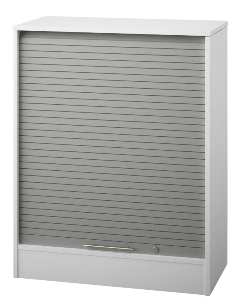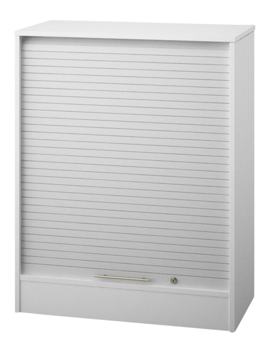 Låsbart (inkl. 2 nycklar). 2 hyllor. Mått: B80xD42xH101 cm. Ljusgrå stomme och jalusi i melamin.