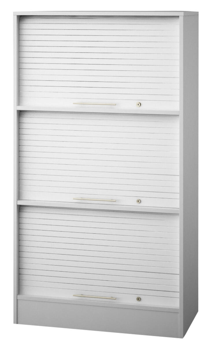 Låsbart (inkl. 2 nycklar). 3 hyllor. Mått: B80xD42xH145 cm. Ljusgrå stomme och jalusi i melamin.