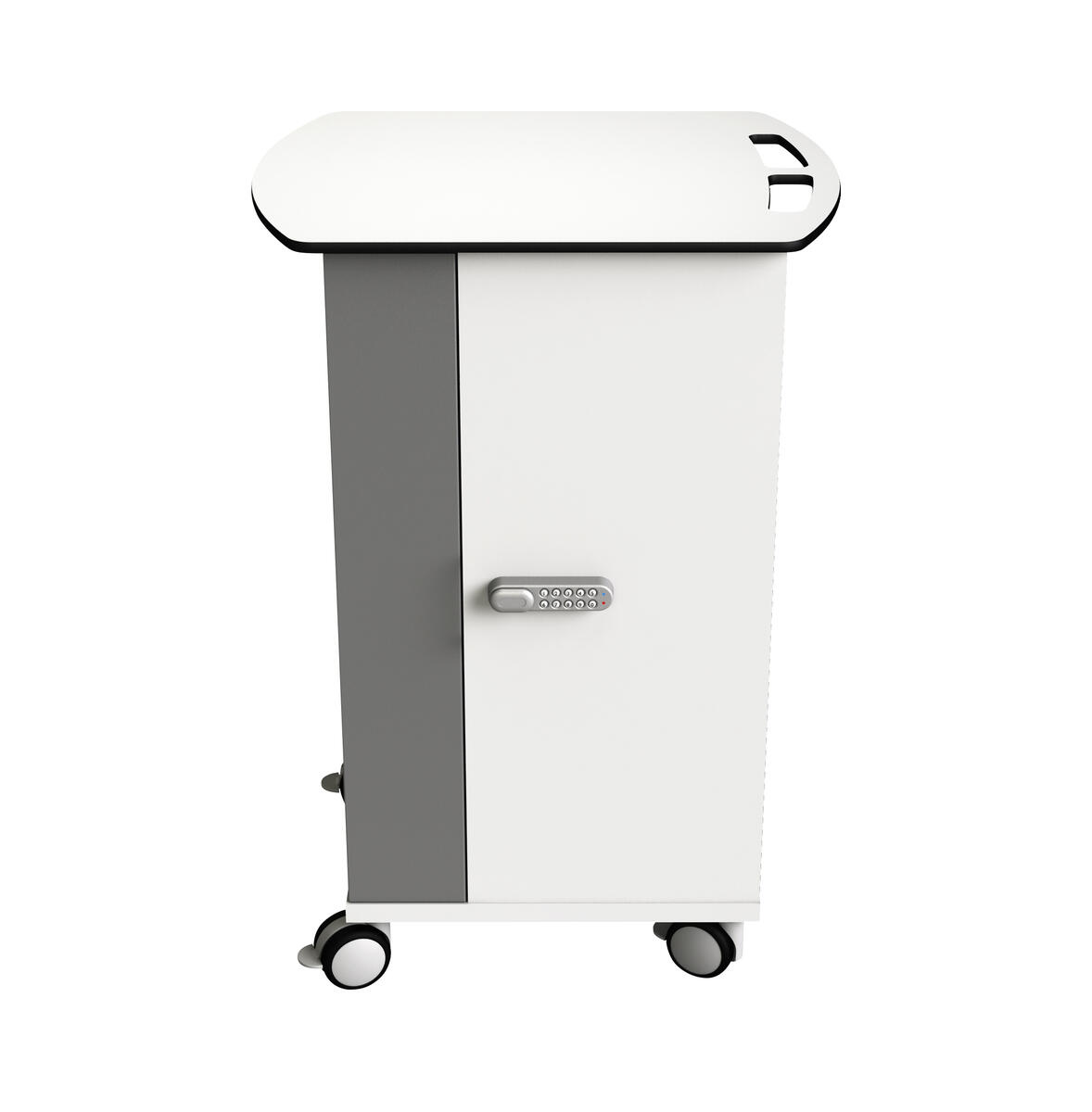 Laddvagn för 32 bärbara datorer med max 16” skärm (de flesta pc och Mac). Tänk på att anslutningen till din laptop ska få plats, särskilt om den sitter på baksidan! Datorernas laddningskablar läggs bakom den färgade panelen och anslutningen sticks ut vid varje fack. För att undvika överbelastning av elnätet mjukstartar laddningen enhet för enhet vid anslutning. Dörrarna öppnas i 270 grader och är låsbara med medföljande nyckel. Kodlås kan köpas till. Låsbara hjul. Mått: B112xD55xH95 cm. Fackens mått: B30xD45xH4,5 cm. Skåp och dörrar i MDF, panel i metall. Kräver 1 eluttag.
