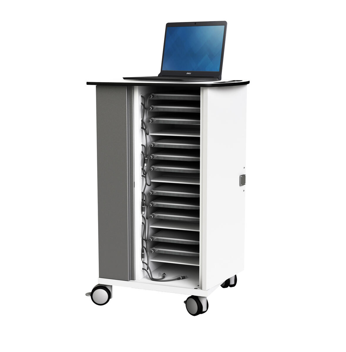 Laddvagn för 16 bärbara datorer med 14" skärm (t.ex. Chromebook). Tänk på att anslutningen till din laptop ska få plats, särskilt om den sitter på baksidan! Datorernas laddningskablar läggs bakom den färgade panelen och anslutningen sticks ut vid varje fack. För att undvika överbelastning av elnätet mjukstartar laddningen enhet för enhet vid anslutning. Dörrarna öppnas i 270 grader och är låsbara med medföljande nyckel. Kodlås kan köpas till. Låsbara hjul. Mått: B64xD50xH95 cm. Fackens mått: B23,5xD40xH4,2 cm. Skåp och dörrar i MDF, panel i metall. Kräver 1 eluttag.