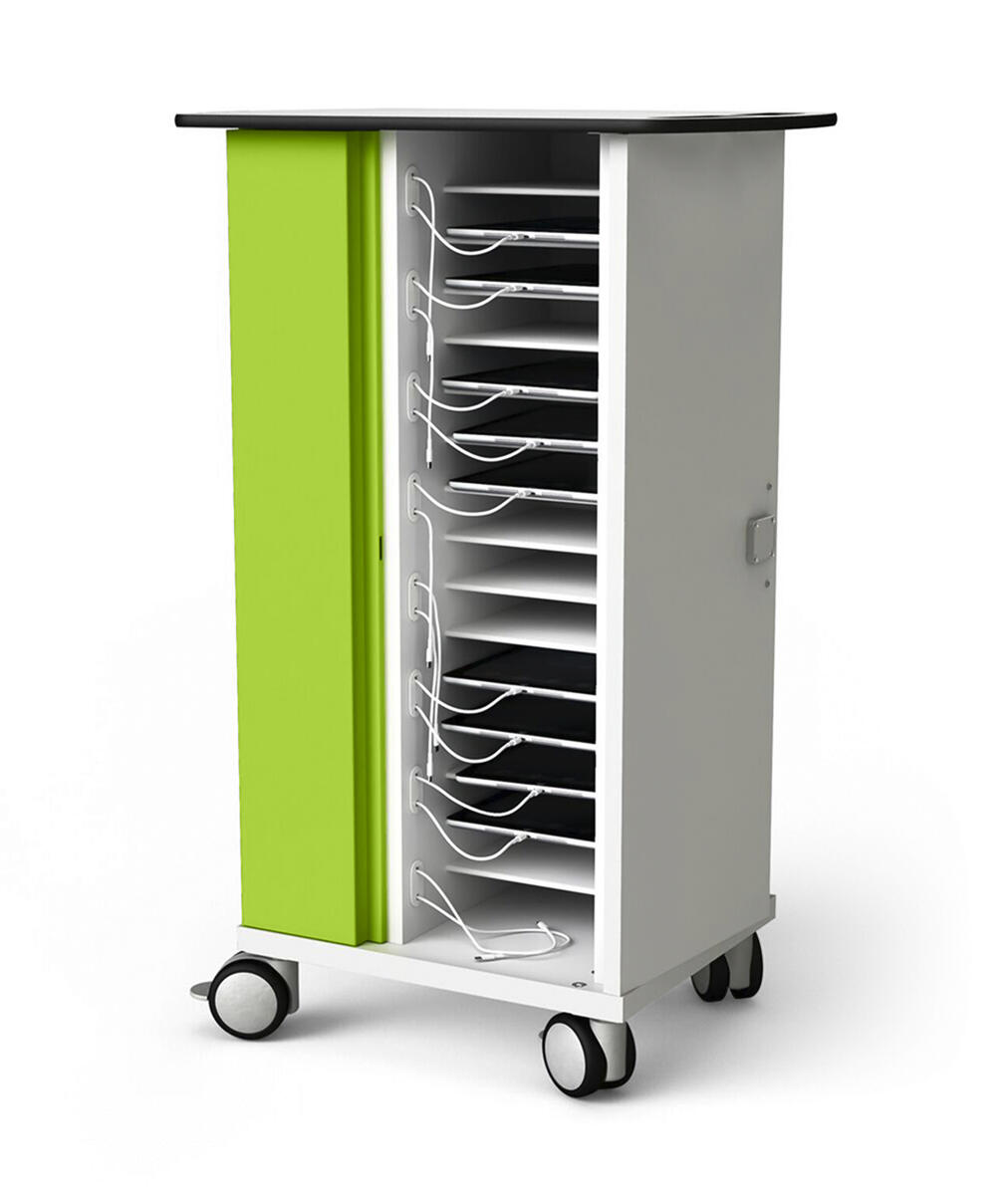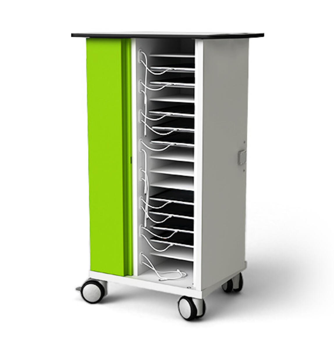 Laddvagn för 32 bärbara datorer med max 16” skärm (de flesta pc och Mac). Tänk på att anslutningen till din laptop ska få plats, särskilt om den sitter på baksidan! Datorernas laddningskablar läggs bakom den färgade panelen och anslutningen sticks ut vid varje fack. För att undvika överbelastning av elnätet mjukstartar laddningen enhet för enhet vid anslutning. Dörrarna öppnas i 270 grader och är låsbara med medföljande nyckel. Kodlås kan köpas till. Låsbara hjul. Mått: B112xD55xH95 cm. Fackens mått: B30xD45xH4,5 cm. Skåp och dörrar i MDF, panel i metall. Kräver 1 eluttag.