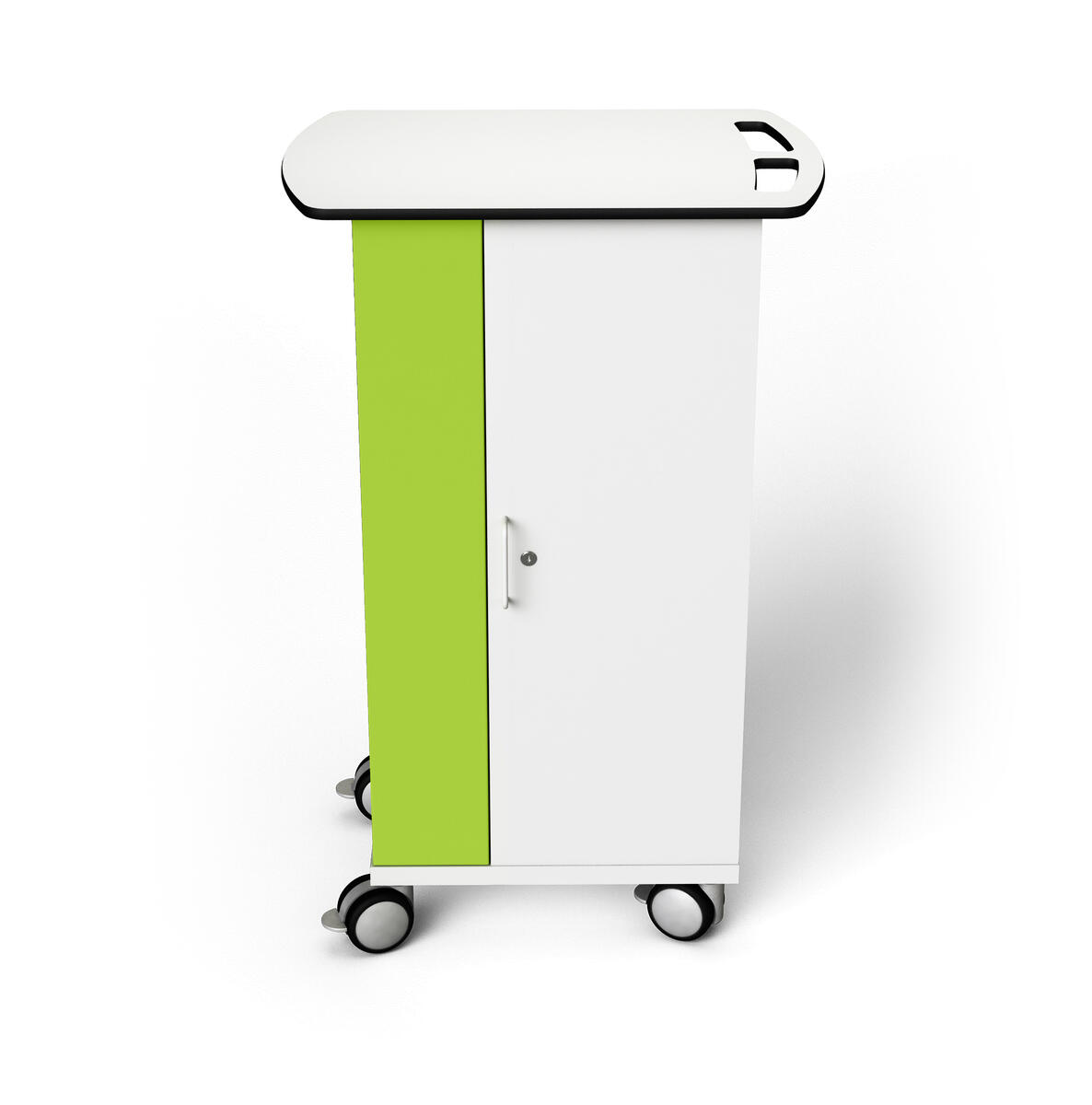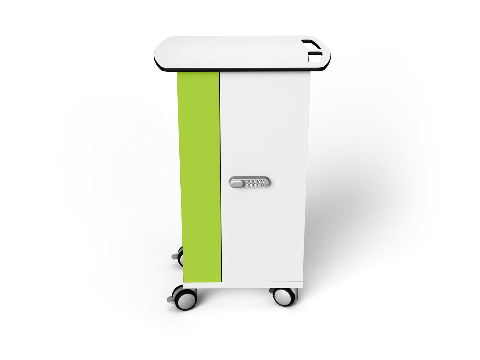 Laddvagn för 16 bärbara datorer med 14" skärm (t.ex. Chromebook). Tänk på att anslutningen till din laptop ska få plats, särskilt om den sitter på baksidan! Datorernas laddningskablar läggs bakom den färgade panelen och anslutningen sticks ut vid varje fack. För att undvika överbelastning av elnätet mjukstartar laddningen enhet för enhet vid anslutning. Dörrarna öppnas i 270 grader och är låsbara med medföljande nyckel. Kodlås kan köpas till. Låsbara hjul. Mått: B64xD50xH95 cm. Fackens mått: B23,5xD40xH4,2 cm. Skåp och dörrar i MDF, panel i metall. Kräver 1 eluttag.
