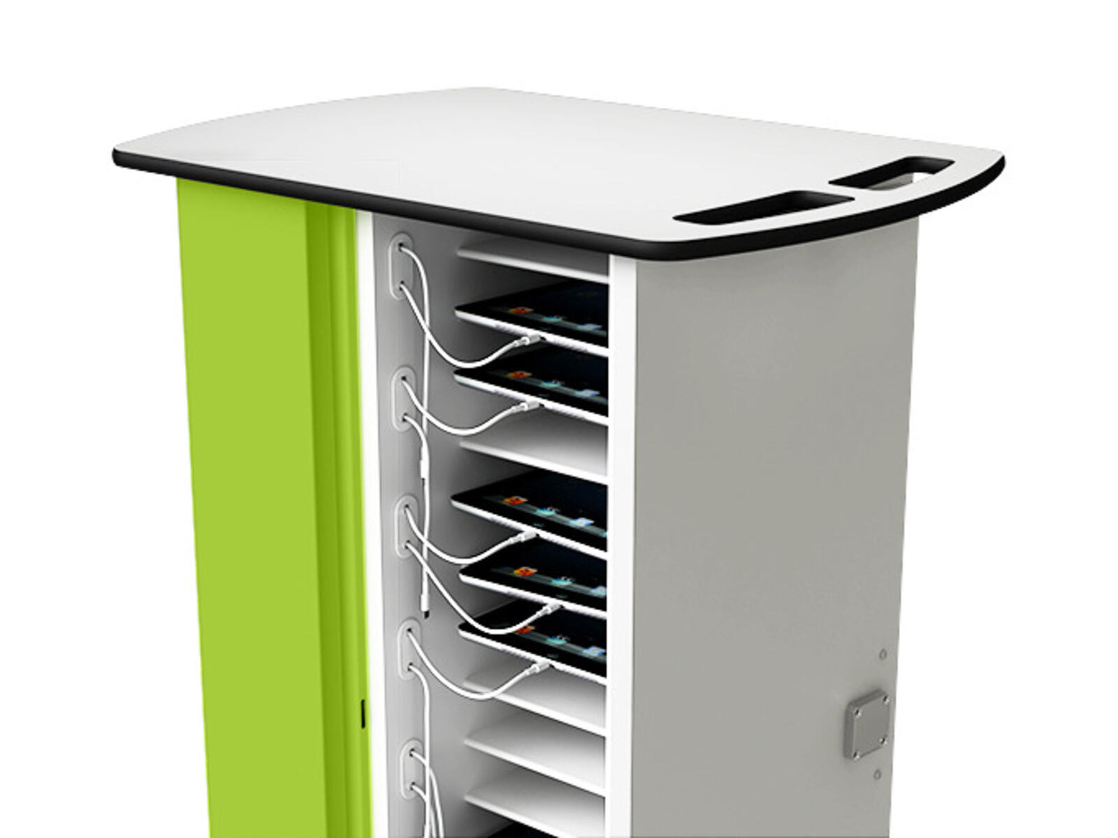 Laddvagn för 32 plattor med max 11” skärm, t.ex. Ipad, lärplatta, surfplatta eller läsplatta. Tänk på att anslutningen till plattan ska få plats! Plattornas laddningskablar läggs bakom den färgade panelen och anslutningen sticks ut vid varje fack. Dörrarna öppnas i 270 grader och är låsbara med medföljande nyckel. Kodlås kan köpas till. Låsbara hjul. Mått: B95xD41xH92 cm. Fackens mått: B21xD31xH3,7 cm. Skåp och dörrar i MDF, panel i metall. Kräver 2 eluttag.