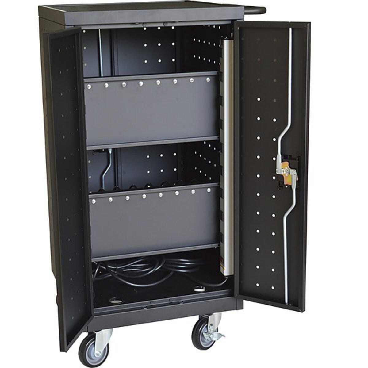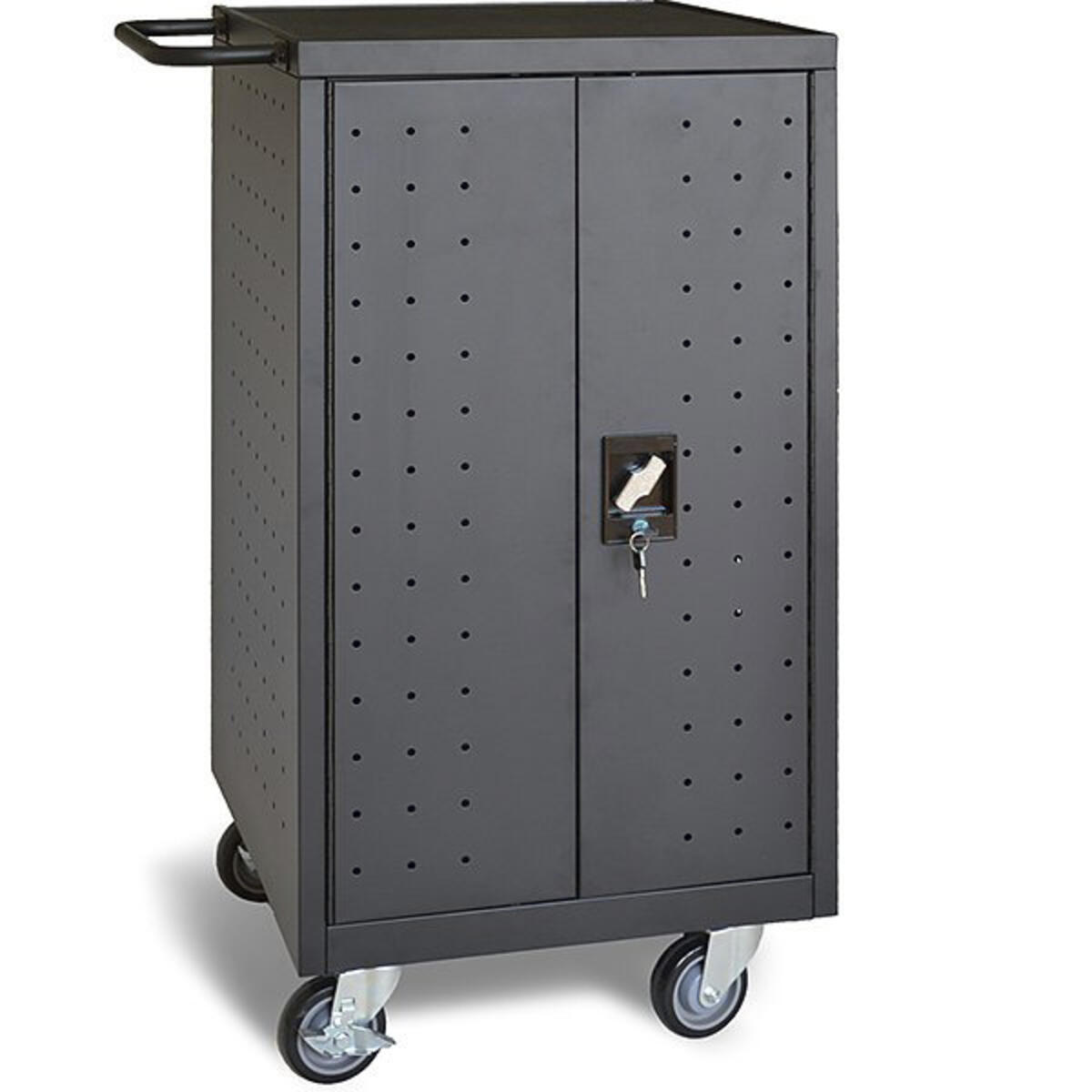Laddvagn för upp till 24 laptops eller annan utrustning. Inredd med 2 hyllplan med avdelare i stål. Varje fack har måtten: B45xD400xH280 mm. Av högkvalitativt kallvalsat stål, tjocklek 0,8 mm.