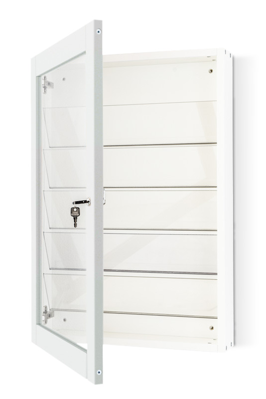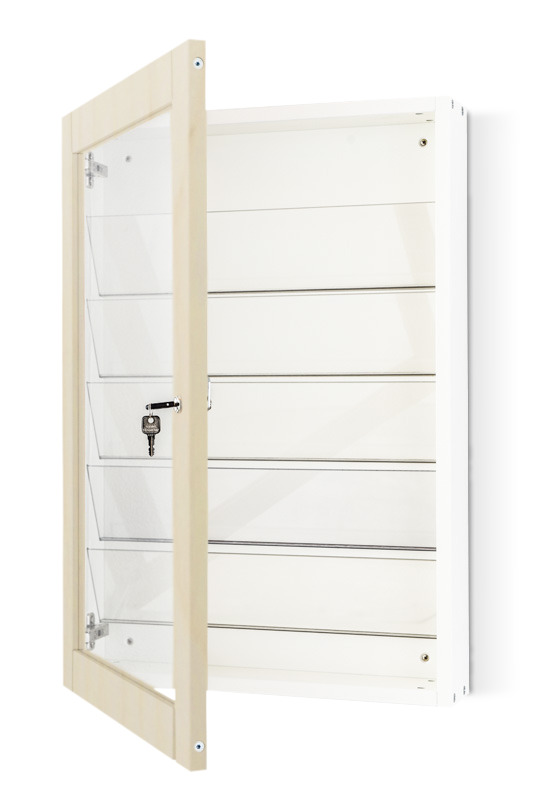 Låsbart mobilskåp med stomme i melaminbelagd MDF och ram kring glas i massivt trä. 5 hyllplan med plats för ca 35 mobiltelefoner. Dörr i 3 mm härdat glas. Hyllplan i 4 mm polyesterglas. 2 nycklar ingår.