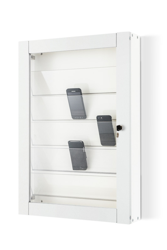 För förvaring av mobiltelefoner i t.ex. klassrum med plats för upp till 30 st med eget fack för varje telefon. Kan monteras på vägg eller placeras på bänk/bord. Av högkvalitativt kallvalsat stål. Ej utrustat med laddning.