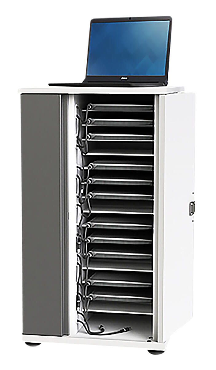 Laddningsskåp för 32 bärbara datorer med 14" skärm (t.ex. Chromebook). Tänk på att anslutningen till din laptop ska få plats, särskilt om den sitter på baksidan! Datorernas laddningskablar läggs bakom den färgade panelen och anslutningen sticks ut vid varje fack. För att undvika överbelastning av elnätet mjukstartar laddningen enhet för enhet vid anslutning. Dörrarna öppnas i 270 grader och är låsbara med medföljande nyckel. Kodlås kan köpas till. Mått: B91xD50xH86 cm. Fackens mått: B23,5xD40xH4,2 cm. Skåp och dörrar i MDF, panel i metall. Kräver 1 eluttag.