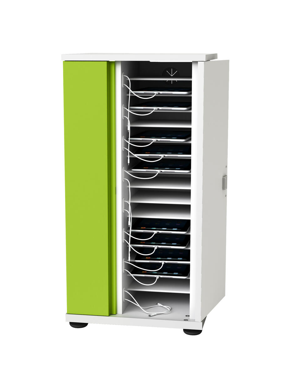 Laddningskåp för 32 plattor med max 11” skärm, t.ex. Ipad, lärplatta, surfplatta eller läsplatta. Tänk på att anslutningen till plattan ska få plats! Plattornas laddningskablar läggs bakom den färgade panelen och anslutningen sticks ut vid varje fack. Dörrarna öppnas i 270 grader och är låsbara med medföljande nyckel. Kodlås kan köpas till. Mått: B84xD46xH85 cm. Fackens mått: B21xD31xH3,5 cm. Skåp och dörrar i MDF, panel i metall. Kräver 2 eluttag.