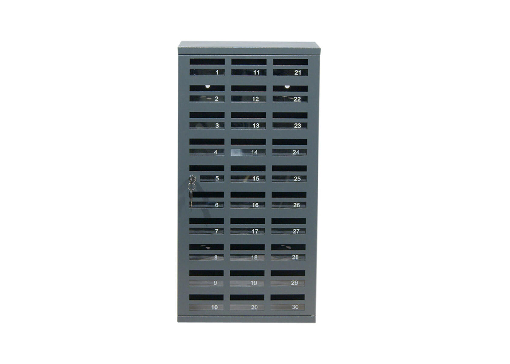 Mobilskåp med 30 separata platser för mobiltelefoner. Skåpet har dörr med numrerade fönster och inkast för varje fack där mobilerna kan placeras även om dörren är stängd/låst. Innanför varje lucka sitter ett plåtbleck vilket förhindrar att någon kan lirka ut en telefon. Hål in i varje fack på baksidan, för laddkablar. Inkast: B98xH18 mm (BxH). Mått per fack: B120xD180xH70 mm. Tillverkat i 0,6 mm plåt med elektrostatisk pulverbeläggning. Nyckellås 2 nycklar ingår. För väggmontering, skruv ingår ej.