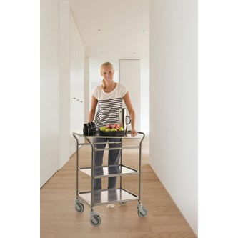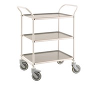 Förvarings- och serveringsvagn med 3 hyllplan. Hyllplanen är vändbara. 4 st länkhjul varav 2 st låsbara, diameter 12,5 cm. Mått hyllplan: L90xB44 cm. Mått hel vagn: L108xB48xH94 cm, vikt: 30 kg. Maxbelastning 250 kg. Pulverlackad eller förzinkad plåt.