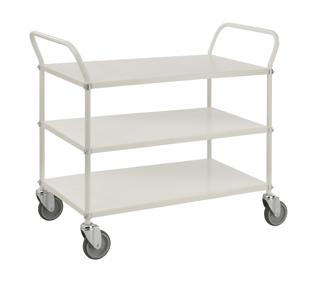 Förvarings- och serveringsvagn med 3 hyllplan. Hyllplanen är vändbara. 4 st länkhjul varav 2 st låsbara, diameter 12,5 cm. Mått hyllplan: L90xB44 cm. Mått hel vagn: L108xB48xH94 cm, vikt: 30 kg. Maxbelastning 250 kg. Pulverlackad eller förzinkad plåt.