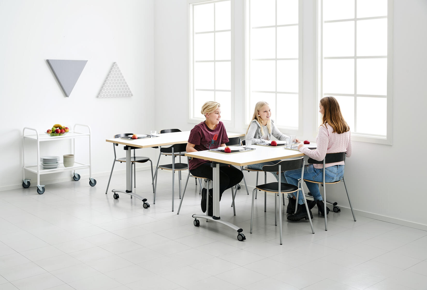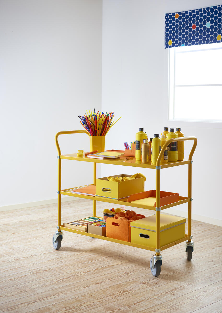 En enkel vagn anpassad för de minsta barnen på förskolan. Avstånd mellan hyllplan: 16 cm. Max belastning per hyllplan är 40 kg. Fyra länkhjul varav två med broms. Hjuldiameter 7,5 cm. Pulverlackad eller förzinkad plåt. Vikt 6 kg. Levereras omonterad.