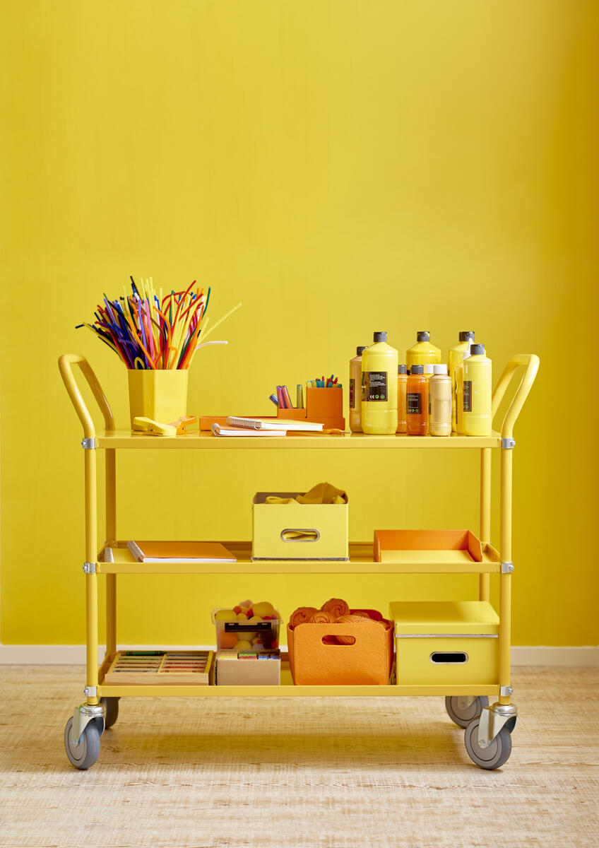 Smart liten vagn med plats för bra tillbehör, och fyra rörliga hjul. Höjd handtag 17 cm. Totalhöjd med handtag 89 cm. Höjd till översta avlastningsyta 72 cm, höjd till nedersta avlastningsyta 22 cm. Mellanrum avlastningsytor 50 cm. Totalbredd 43 cm, mått avlastningsyta 39 cm. Längd avlastningsyta 75 cm, totallängd avlastningsyta med handtag 86 cm. Hyllplan i spånskiva med laminat.